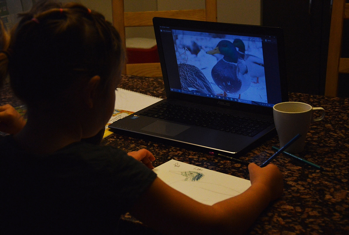 Namie bandėm antis nupiešti. Žiūrinėjom nuotraukos ir piešėm. Aš nupiešiau kontūrus, vaikai spalvino. Klijuosim į gamtininko dienoraštį. Emilija štai tokį tekstą man padiktavo: