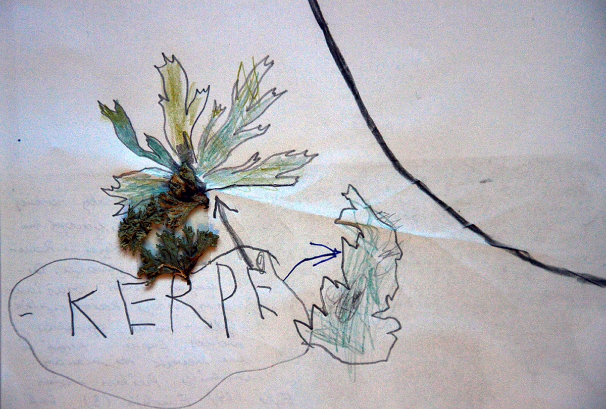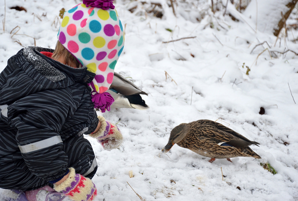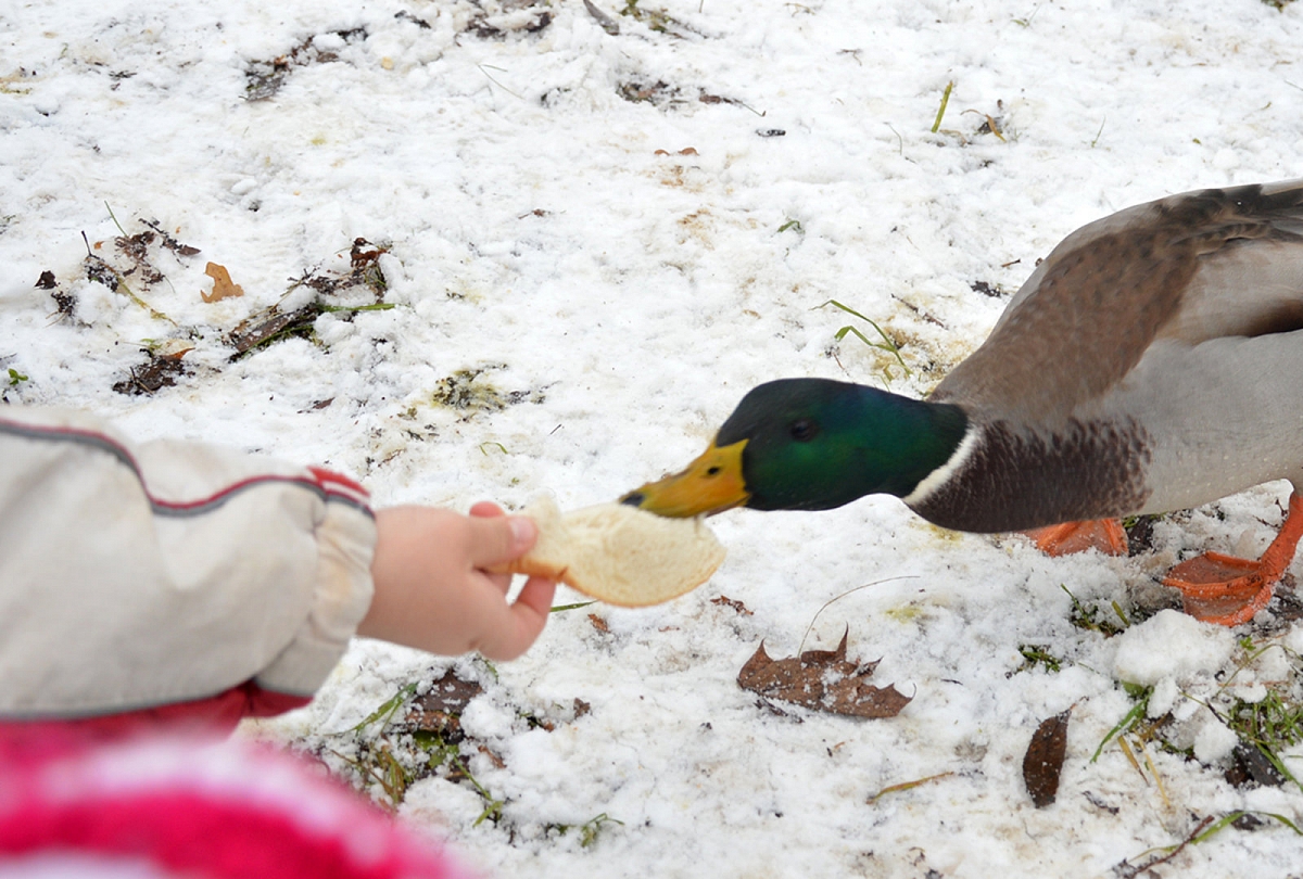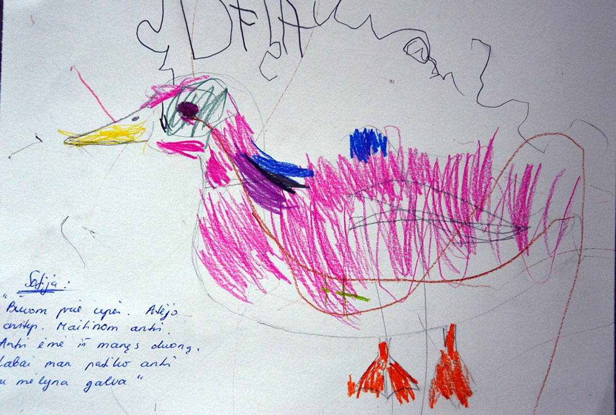„Mes šėrėm antis. Parke. Antys pešėsi dėl maisto. Ėmė net man iš rankos. Matėm rudas antis ir žaliom galvom. Ančių kojos buvo oranžinės. Beveik guminės kaip botai. Kai antys nuskrido, pakilo vėjas nuo sparnų“.