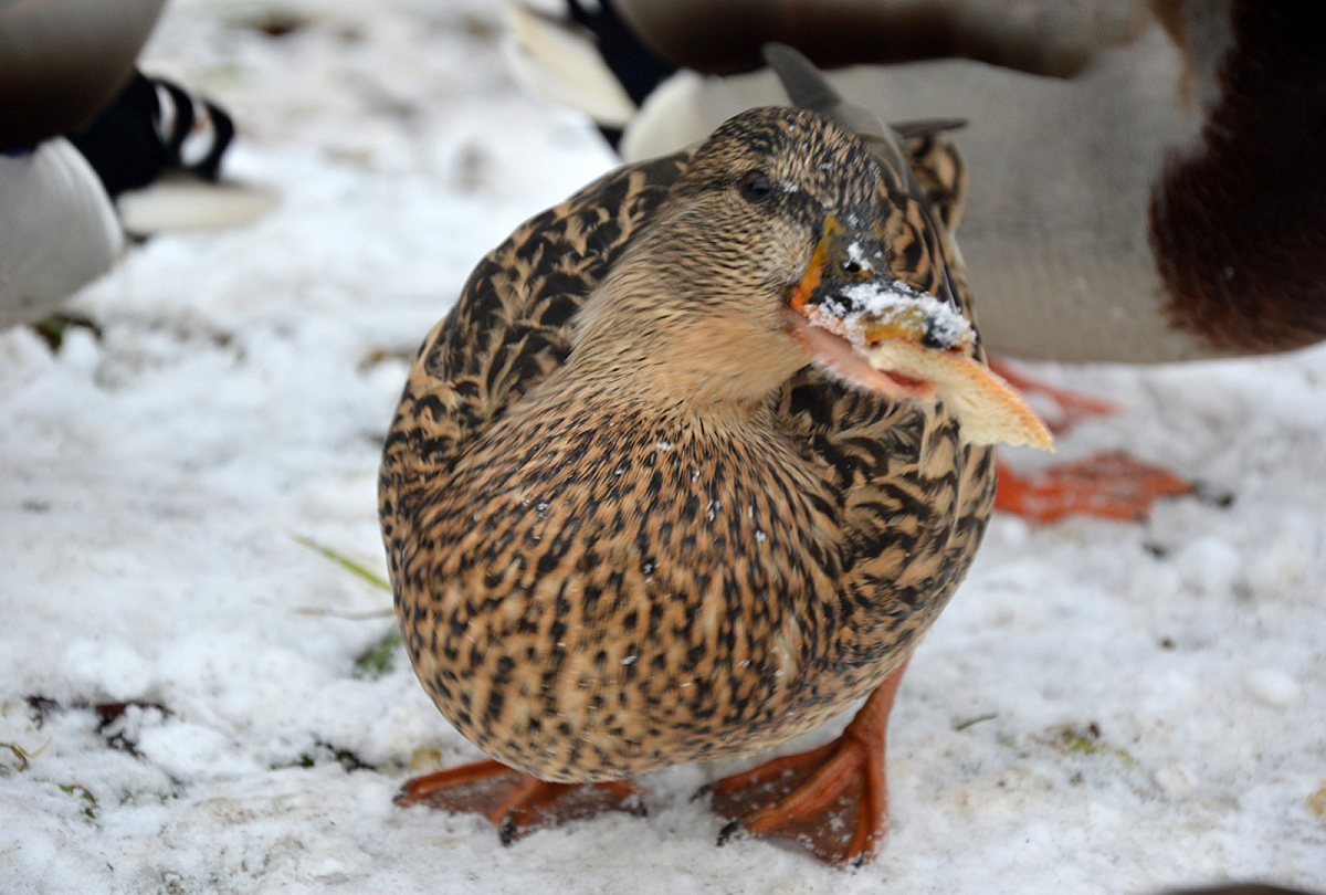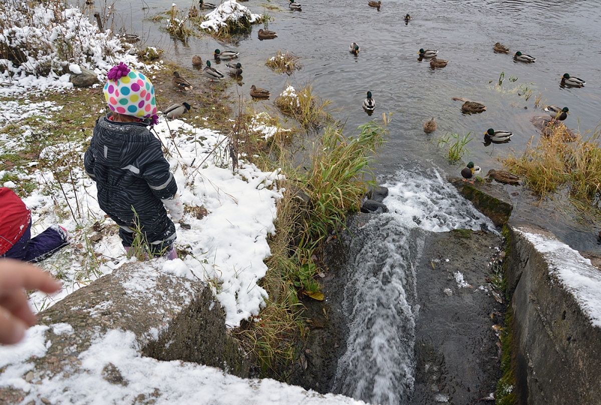 Na... daug čia visko būta. Tačiau kai ko vaikystėje tikrai nebuvo. Pavyzdžiui ančių... Šių laikų antys drąsios, netgi įžulios. Jos žmonių nebijo. Mums batoną tiesiai iš rankų graibstė. O atkrypavo jos tvarkinga vorele iš upės. Pamatė mus, sustojusius net ne pakrantėje, o dar ant pėsčiųjų tako (dar net duonos nespėjom išsitraukti! Jos ką, duoną užuodžia?) ir susirinko aplink mus. Vaikai krykštavo, aš fotografavau, dar protarpiais bandžiau atkreipti vaikų dėmesį į ančių spalvas, plunksnų raibumą, kojas, akis ir t.t. Buvo smagu. Netikėta.