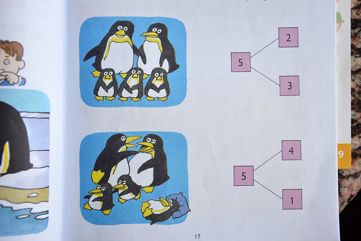 ** Bendras vaizdas - labai apkrauta; sausa ir nepatrauklu. Paveikslėliai nepriverčia vaiko pagalvoti (Singapore Math paveikslėliuose neprašoma suskaičiuoti kiek klasėje kėdžių ir pan, iš paveikslėlių reikia išmąstyti).