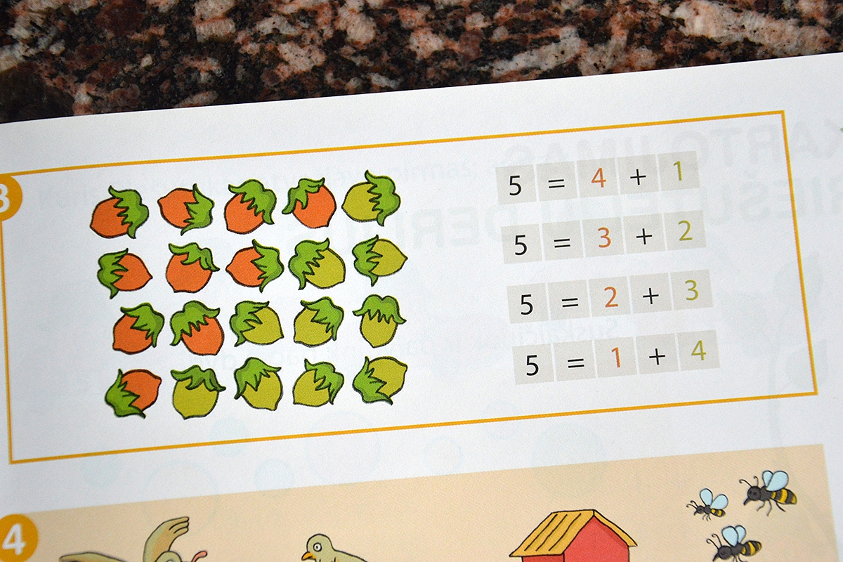 Toliau pamoka apie sudėtį iki 5 (panašiai atrodo visas likęs vadovėlis):