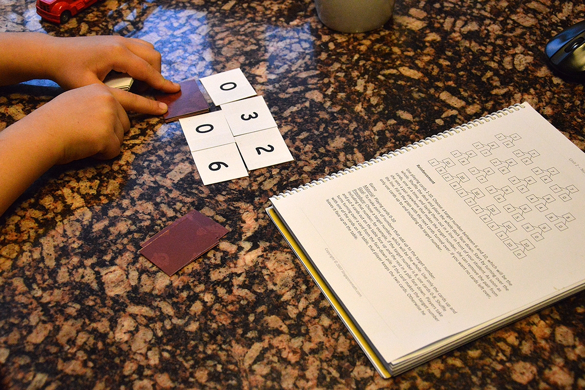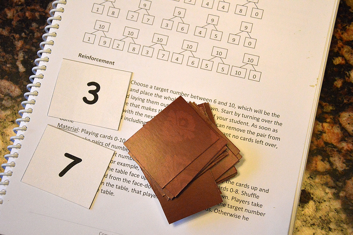 Vadovėlio pradžioje surašytos papildomos priemonės, kurias reikėtų pasigaminti ar įsigyti. Tai kortelės su skaičiais, skaičių pavadinimais ir taškais. Be to, rekomenduojama įsigyti skaičiavimo kubelius (angl. multilink cubes), tačiau mes puikiausiai išsiverčiam su lego kubeliais. Taip pat dvi kaladės žaidimo kortų (iki 10). Tuomet su šiom pagalbinėm priemonėm kiekvienoje temoje yra sugalvota fantastiškų žaidimų, kurie gilina temos supratimą. Vien tik tie žaidimai mane iš koto verčia. Per tokius paprastus žaidimus su Emilija įtvirtinom įvairių skaičių sudėtį iki 10. Gal jūsų vaikui tai vieni niekai, bet mano Emilija stipri vizualikė - jai reikia matematiką žaisti, o ne skaičiuoti.