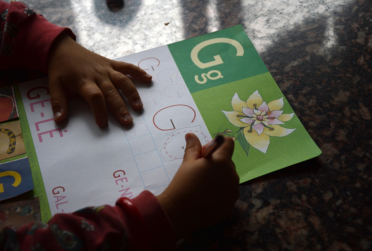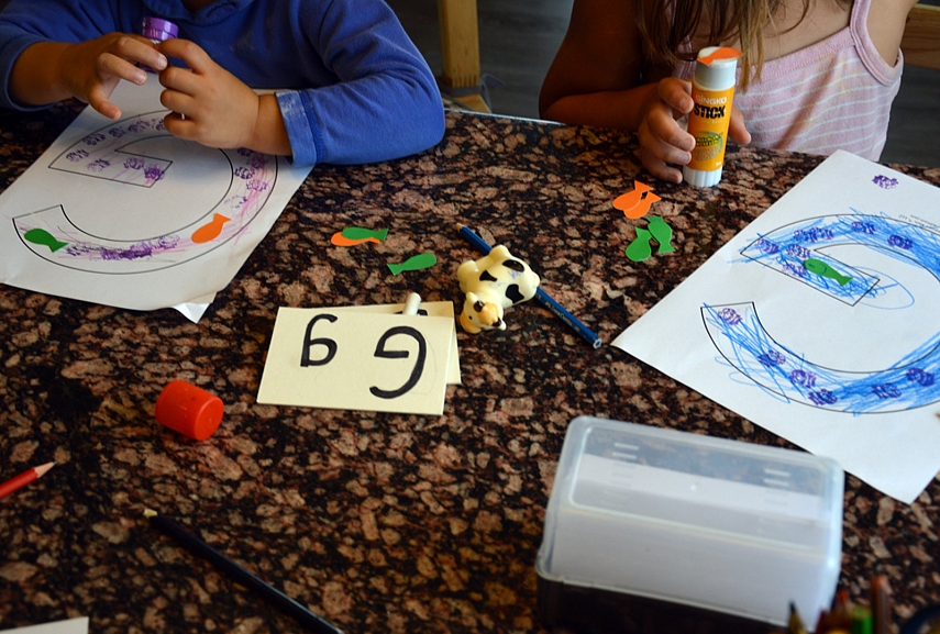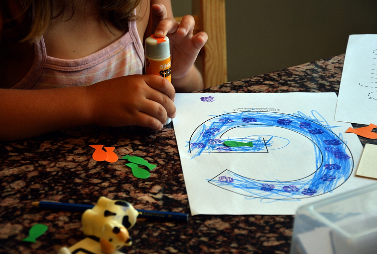Kai jau ant sienos nebebuvo vietos net taško padėti, sėdom prie stalo. Raidės G trafaretus puošėme mėlynai – tai vandenėlis, per kurį plaukė mūsų žąselė. Dar kartą padainavom dainelę (dainuodamos, plaukėme pirštu raidės kontūru).