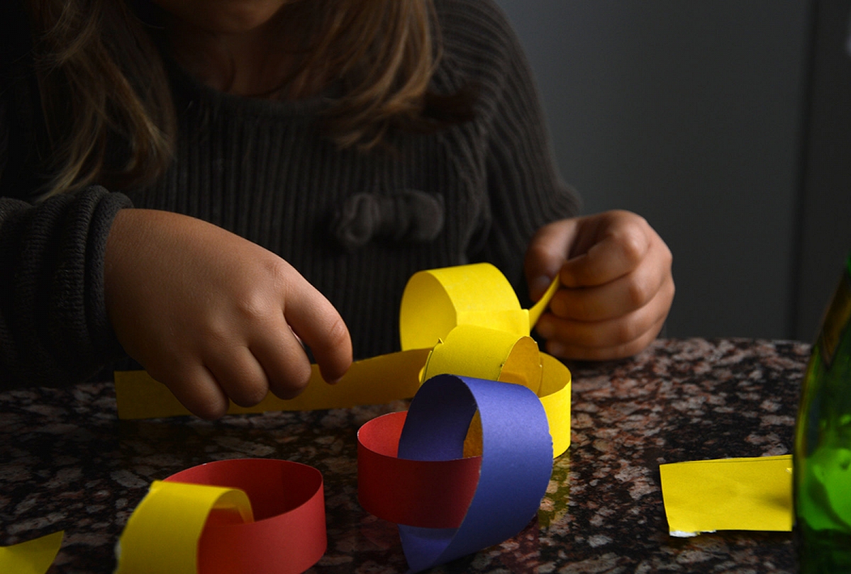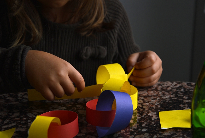 Beje apie girliandą... Atrodytų, kad šis darbelis pasenęs ir nuvalkiotas, tačiau koks naudingas mažiesiems pirštukams! Vien prikarpyti juostelių girliandos pynimui buvo didelis iššūkis kantrybei bei pirštų miklumui. O kur jau girliandos žiedų vėrimas ir klijavimas, spalvų derinimas, dviejų girliandų sujungimas į vieną - super pratimas visokiai koordinacijai..