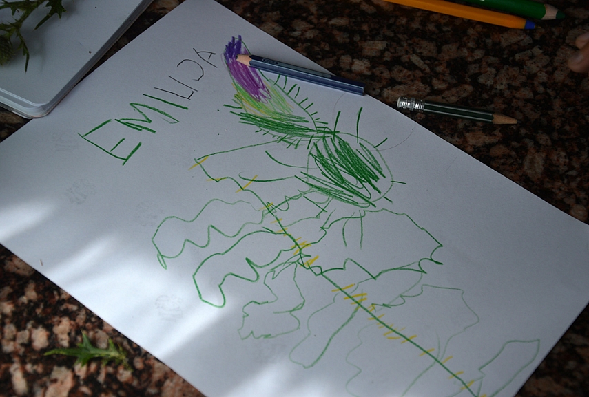 Dailė Parsinešėm iš laukų usnį. Emilija ją piešė.