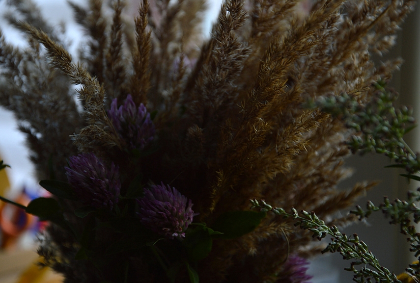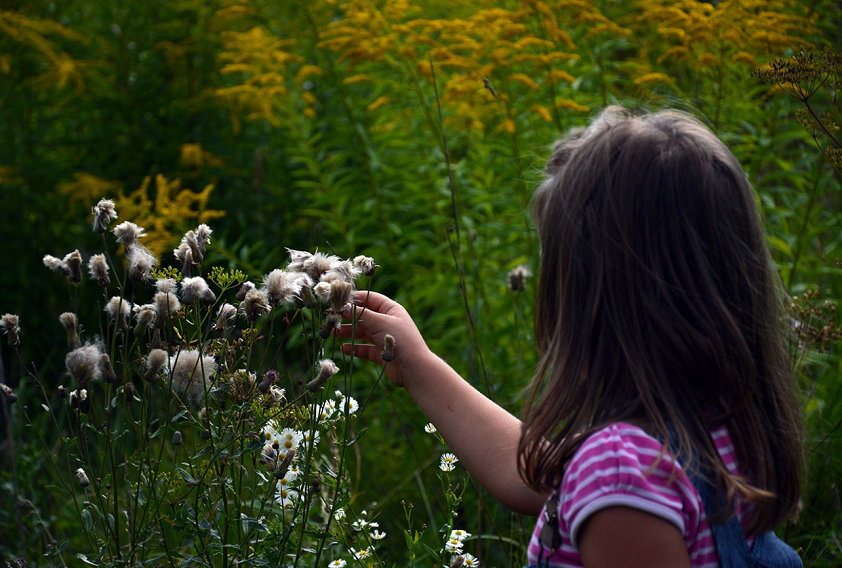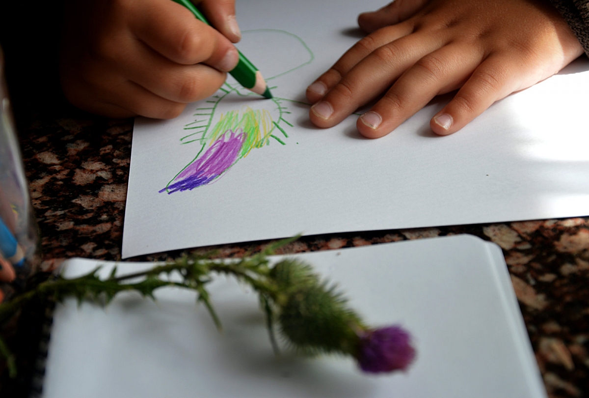 Gamta. Vasara eina į pabaiga. Dauguma gėlių mūsų apylinkėse jau nužydėjo. Ta proga po truputi pradedu vaikams kalbėti apie sėklas, kurias rudeniop subrandina medžiai ir augalai. Vieno pasivaikščiojimo metu bandėm išardyti jauną eglės kankorėžį, ten radom dailiai po dvi sugulusias sėklytes. Aplankėm kaiminystės ažuoliuką, prisinešėm namo žalių gilių (galvojau, kad giles piešim, bet vaikam smagiausia nuiminėti gilių kepurėles). Pievos pakeitė savo rūbą: dabar jis nebe toks gyvas ir primargintas, o tartum sendintas medis – pilkšvas, su baltais, rusvais, protarpiais melsvais, rausvais potepiais. Ir puokštės mūsų jau rudeniu kvepia.
