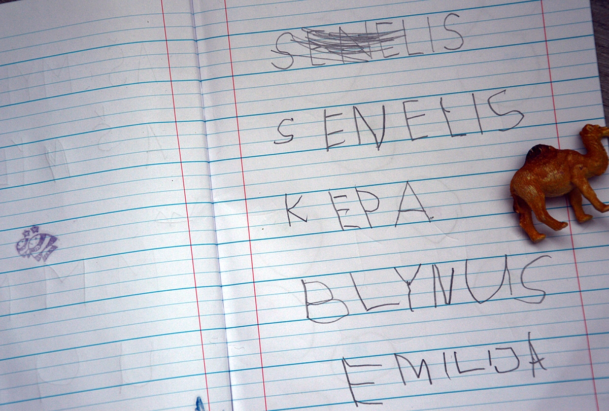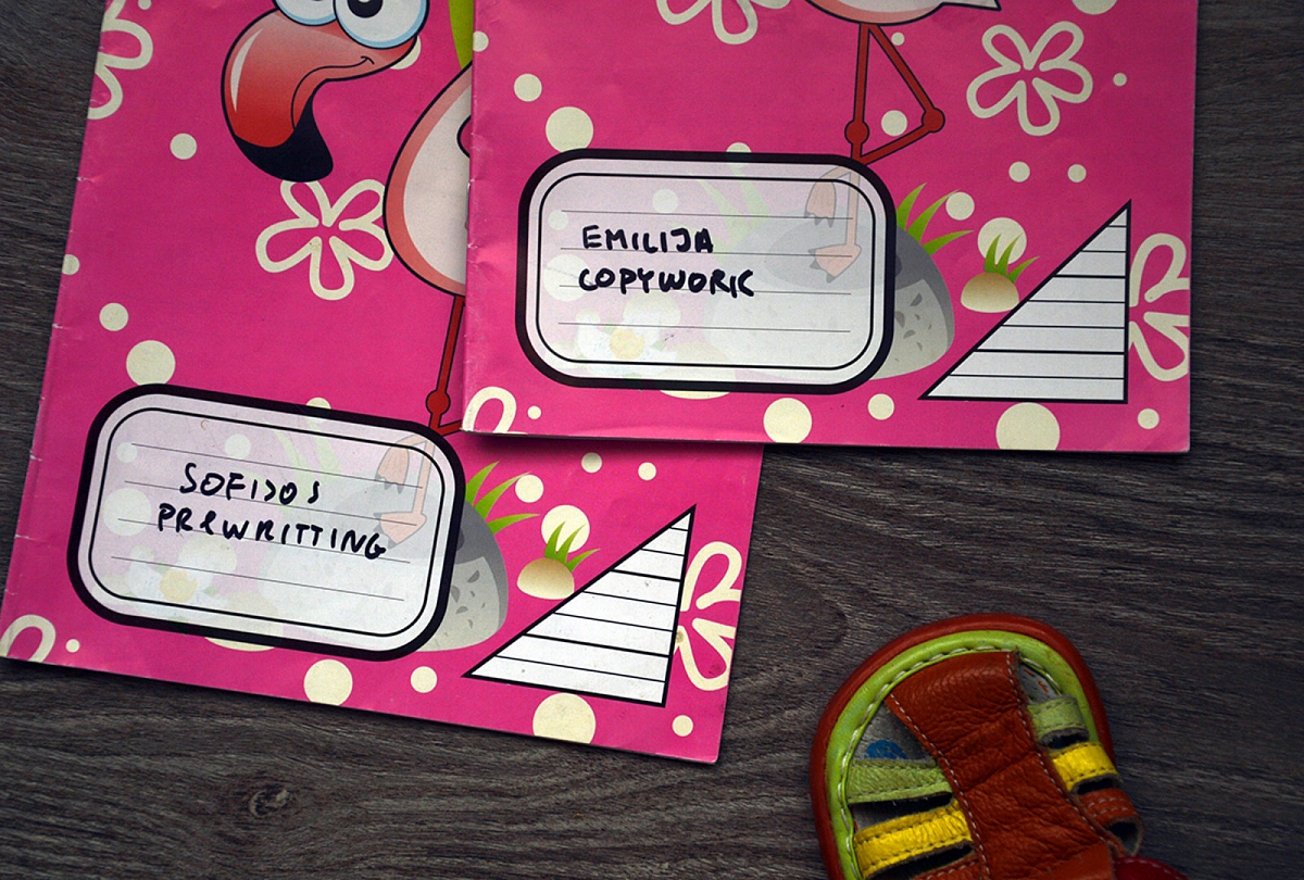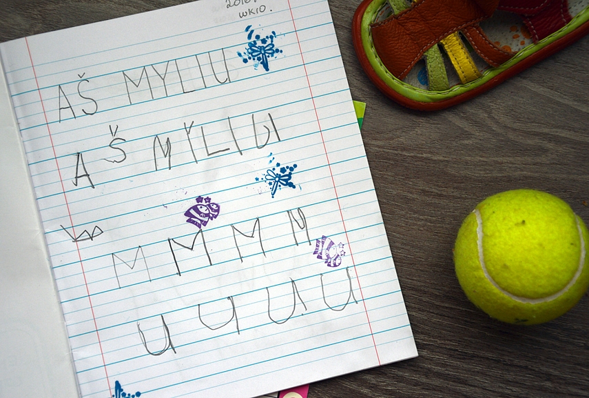 Rašymas. Šią savaitę laiškų nerašėm, tačiau pradėjau copywork. Copywork – tai kopijavimas, perrašymas. Duodi vaikui kažkokį sakinį (vieni duoda Biblijos eilutes, kiti poeziją, dar kiti sugalvotus sakinius) ir prašai, kad jis jį perrašytų. Kol vaikas tik pradeda rašyti, sakiniai bus trumpi – vos keli žodeliai. Vėliau sakiniai ilgės, virs neilgom pastraipom. Toks perrašymas ne tik lavina vaiko ranką, bet, pailgėjus sakiniams, ir ūgdo jo supratimą apie sakinio, paragrafo struktūrą, skyrybą, stilių. Šią savaitę daviau labai lengvus, spontaniškai sugalvotus sakinius: Aš myliu. Senelis kepa blynus. Kiškutis ir jo mama. Abi su Emilija džiaugiamės, kad pavyksta s raidė (ilgą laiką s raitydavosi vis į priešingą pusę).