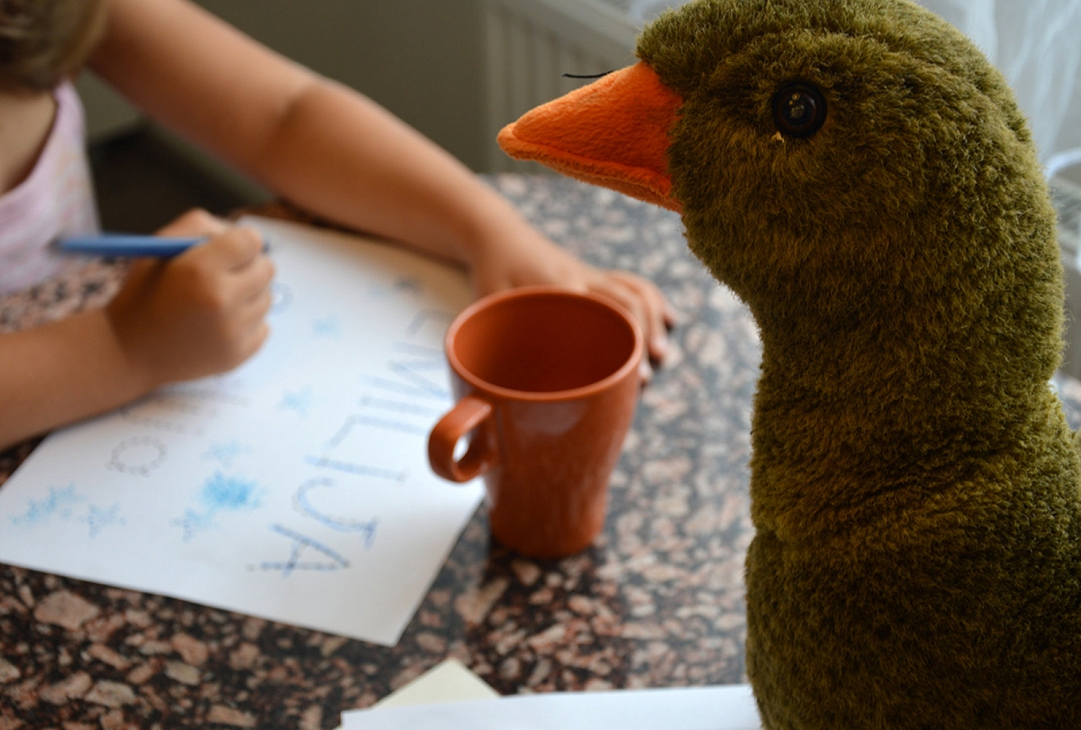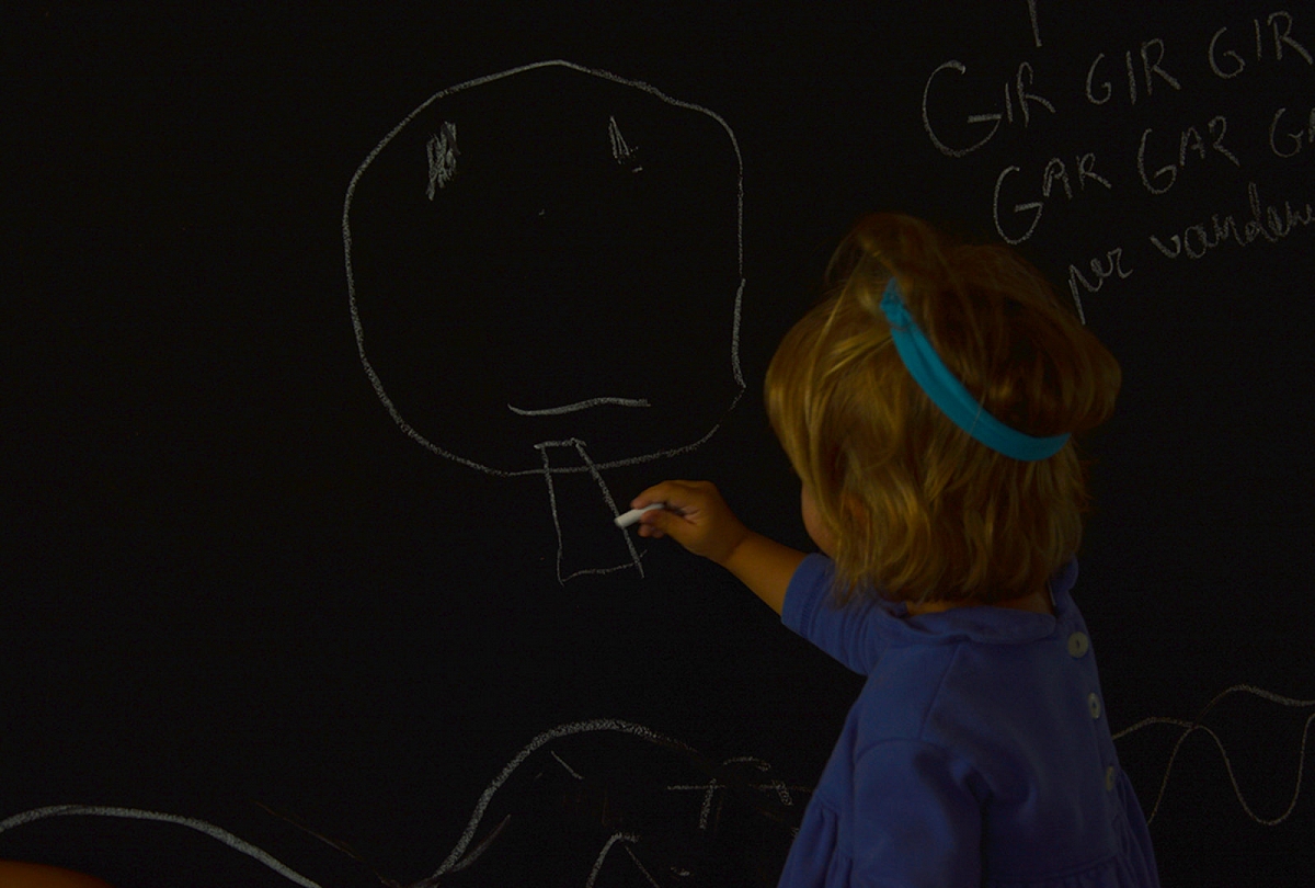 Su daina visada smagiau, todėl užtraukėm Plaukė žąselė per vandenėlį / Gir gir gir, gar gar gar / Per vandenėlį. Balta kreida ant sienos pripiešėm žąseliai bangų (smulkioji motorika), per kurias ji galėtų plaukti. Tuomet Emilija panūdo išmokti piešti žąsį – mokėmės piešti žąsį. Sofija mūsų juodąją sieną regis atrado iš naujo bei pati nutebo savo rankos tikslumu (senokai piešė su kreidelėm, todėl ranka tikrai gerokai išlavėjus).