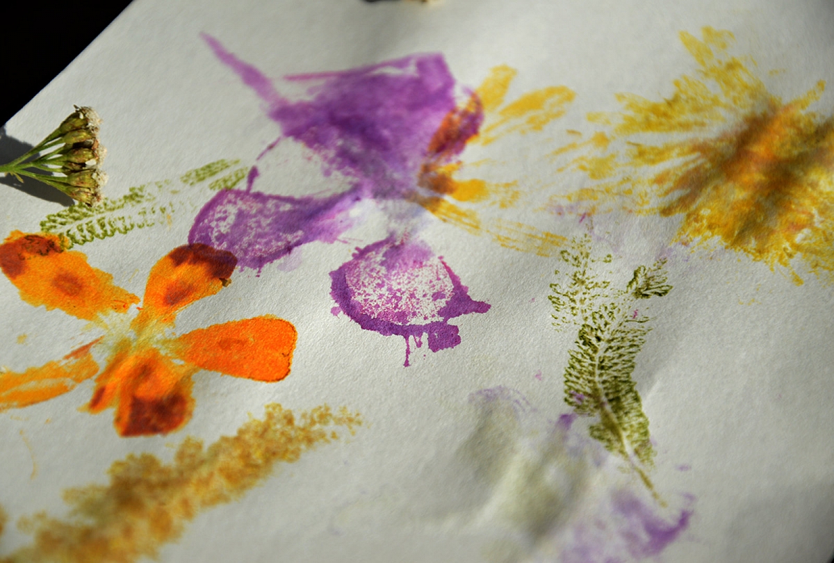 Taip pat išbandėm gėlių atspaudus (plaktuku bildenom į tarp dviejų akvarelės lapų įspraustas gėles).