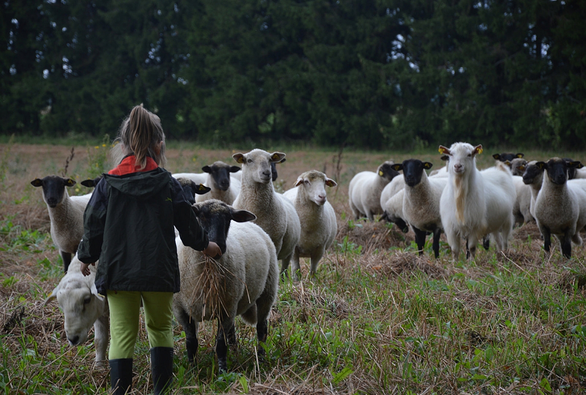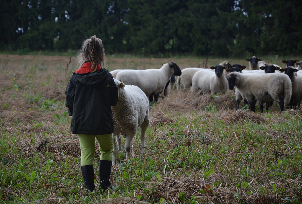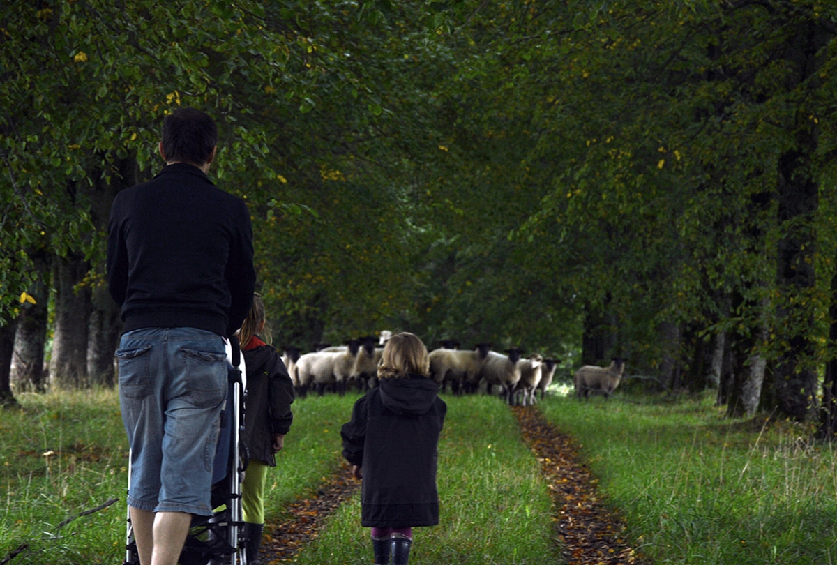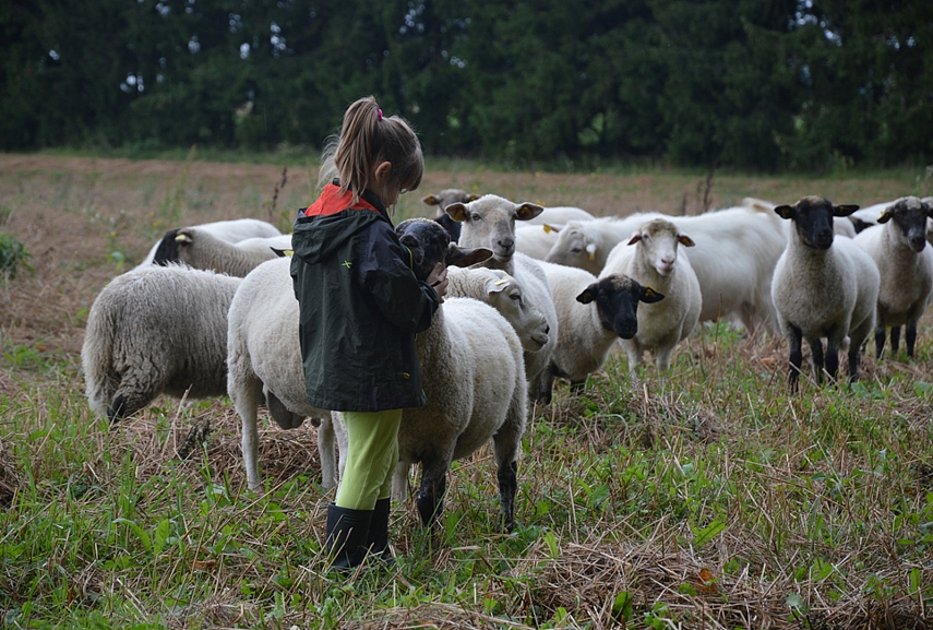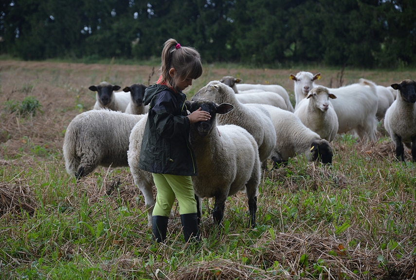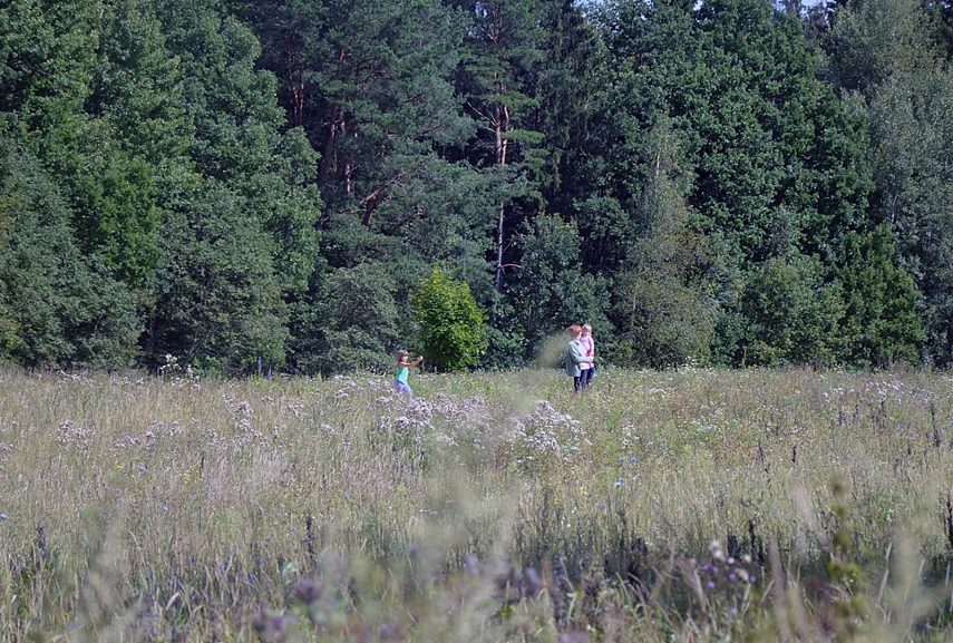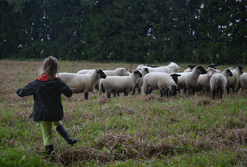 Šį kartą avių garduose nebebuvo – vasarom ganyklose gyvena. Tiek jau to, nosies dėl to nukabint neverta. Nepamatę avių, patraukėm ilga šimtamečių medžių alėja apžiūrėti teritorijos. Vaikų džiaugsmui, alėjos gale, laukuose aptikom avių bandą. Pirmiausia gyvuliukai išėjo į kelią mūsų pasitikti. Avys sustojo, mes sustojom – vertinam situaciją. Tuomet avys dėjo į kojas. Jos labai bailios: mes žingsnį artyn, jos - dvidešimt tolyn. Emilija nenuleido rankų. Kantriai, kantriai, iš lėto, be baimės prisiartino prie avių. Nustebino, kad ji labai instinktyviai gaudėsi situacijoje – aš taip nesugebėčiau. Pirmiausia iš bandos išėjo patinas. Jis turėjo Emiliją išmatuoti. Gavusi bandos lyderio pripažinimą, Emilija galėjo susipažinti su smalsiausia ir drąsiauia bandos avimi. Reginys buvo nepaprastas. Su Aurimu stovėjom atokiau be žado ir abu tyliai mąstėm, kad Emilija – tikrai ne miesto žmogus, jai reikia gyventi kaime. Svajojam. Judam link to. Beje... kai prie avių ėmė artintis Sofija, avinas išlėkė į priekį ir piktai treptelėjo koja. Ženklas, kad Sofijai dar reikia ūgtelėti...