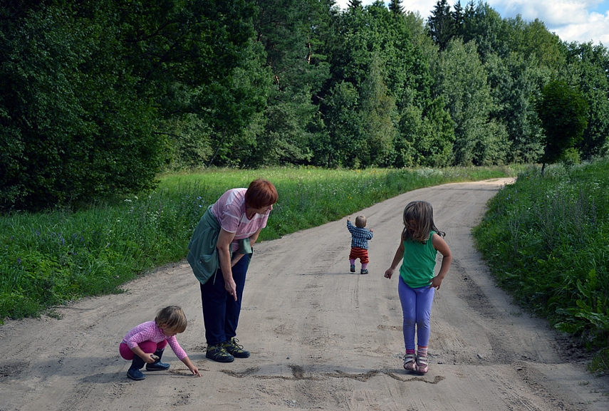 Na o savaitės pabaigoje išvykom Žemaitijon, pas Aurimo tėvus. Vaikščiojom laukais, važiavom į Klaipėdą, buvom delfinariume, maudėmės jūroje (mano vaikams oro ir vandens temperatūra neturi jokios reikšmės), gaudėm varlytes, „grybavom“, supomės ir šiaip dūkom su teta Beatriče. Vieną iš viešnagės dienų vaikai su močiute Judita ir teta Beatriče lankėsi Telšiuose.