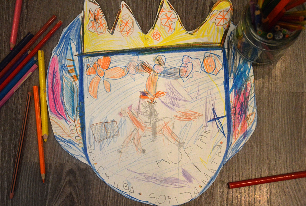Pakalbėjom apie tai, kad gyvename tokioje šalyje vardu Lietuva, kad kiekviena šalis turi savo vėliavą, herbą ir himną. Klausėm Lietuvos himno: paprastą versiją, Erikos ir Jurgio atliktą jaukų šeimyninį variantą. Tuomet gaminome šeimos herbą.