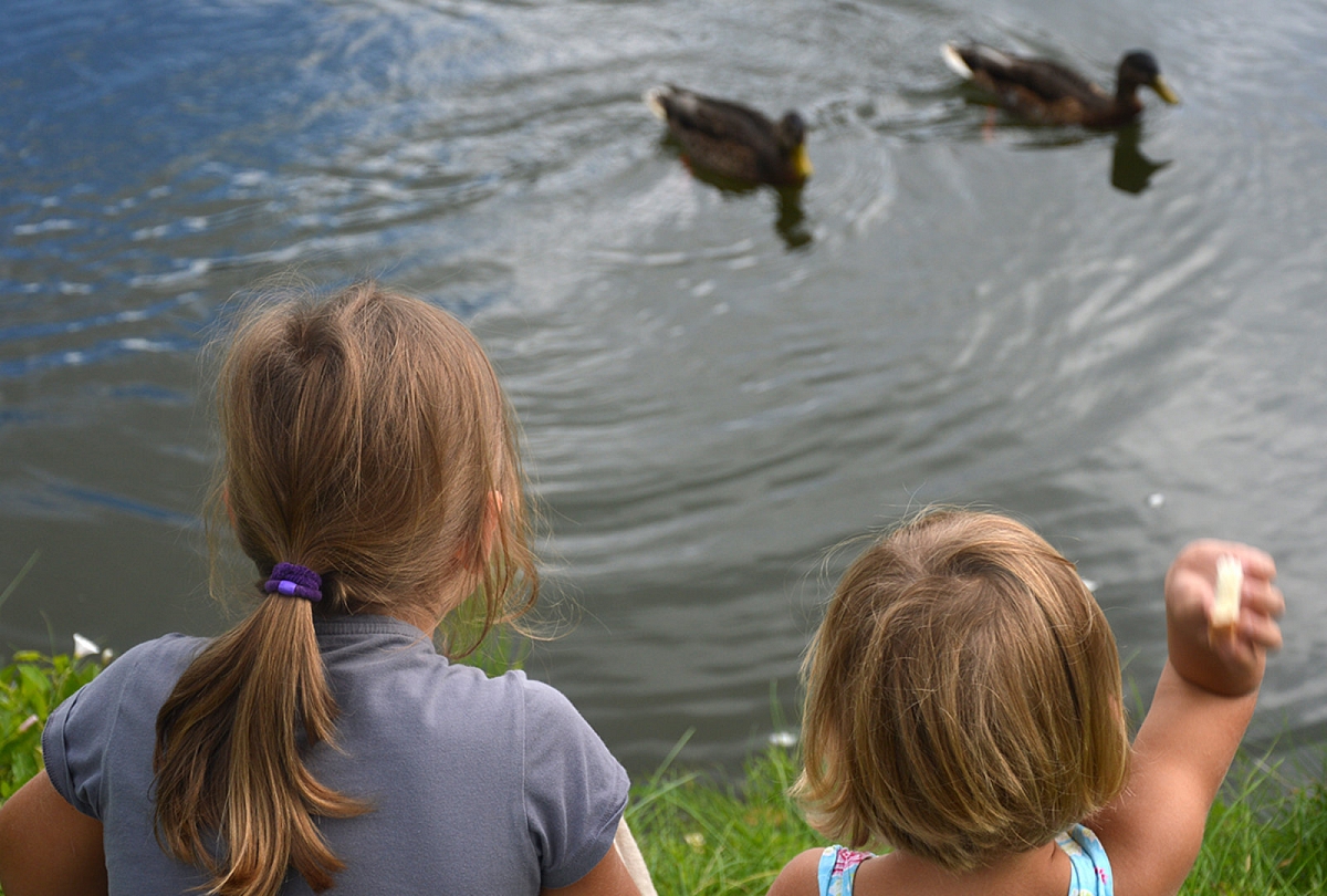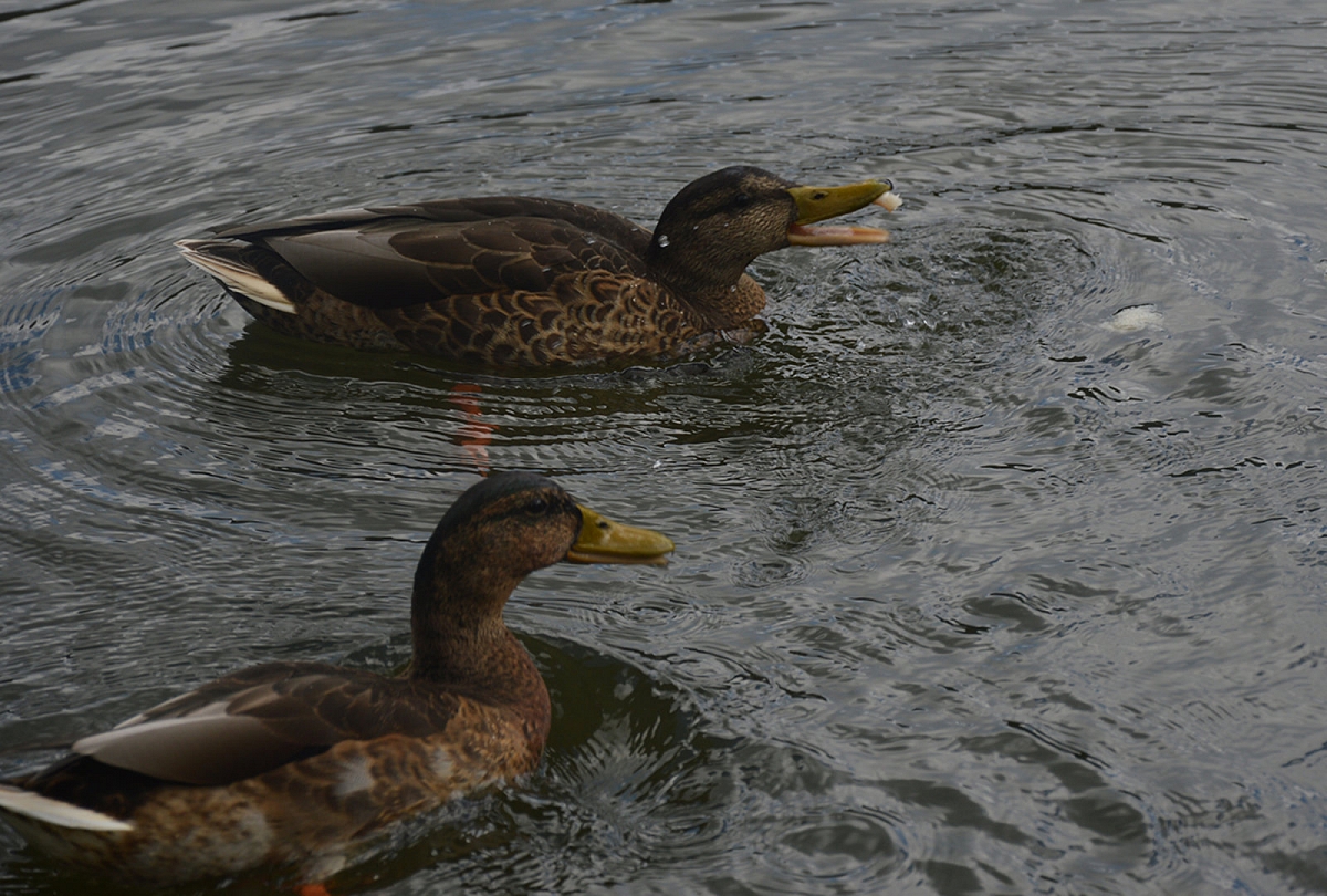 Kitą dieną keliavom prie vietinio tvenkinio pamaitinti ančių. Pamatėm trijų rušių plaukikes.