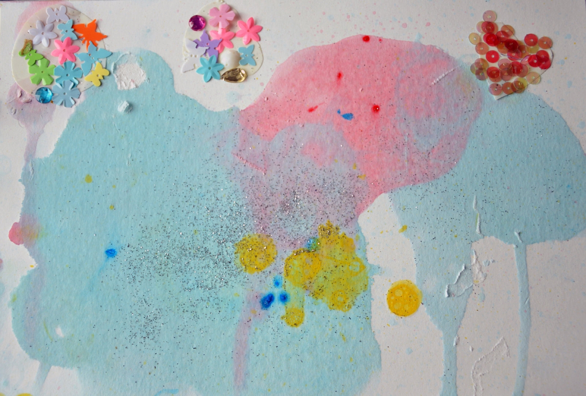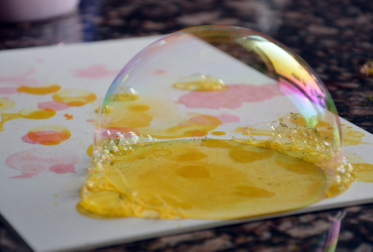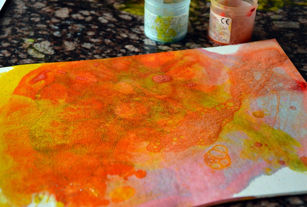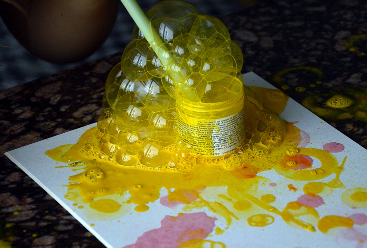 Dailė. Nusižiūrėjau Pintereste, kaip vaikai piešia muilo burbulais –mgaunasi tokie gražūs ratilai ant popieriaus... tikros O raidės. Juk taip į temą. Tad pabandėm ir mes. Žinoma, O raidžių pas mus nė kvapo nebuvo, bet vaikams patirtis superinė. Neturėjau namie skystų dažų, todėl teko šiek tiek paeksperimentuoti – sumaičiau akrilinius dažus su vandeniu ir rankų muilu. Daviau šiaudelių – pūskit. Receptūrą dar reikės patobulinti – pernelyg švelnios spalvos.