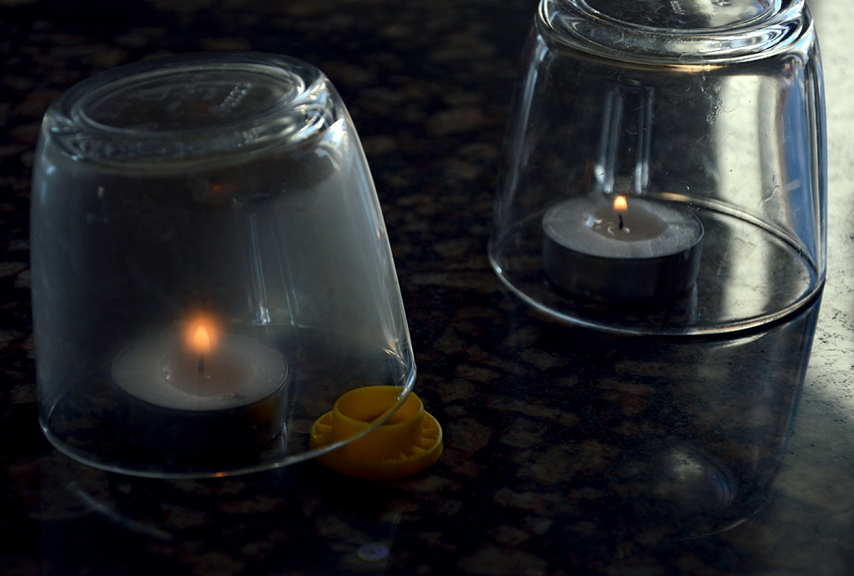 Ir dar apie orą... tik iš kitos pusės. Pabandėm atlikti savo pirmuosius „mokslinius“ bandymus. Nežinau, kas labiau skraidė padebesiuose - ar aš, ar vaikai. Niekad gyvenime nemačius net paprasčiausių bandymų (mūsų mokykloje mokytojai nesivargindavo...), jaučiausi lyg vaikas žaislų parduotuvėje. Taigi. Bandėm įrodyti, kad ugniai degti reikia oro. Tereikia uždegti žvakę ir ją uždengti stikline. Po kelių akimirkų žvakė užgęsta. Bet kad būtų kiek aiškiau, es paemėm dvi vienodas žvakes ir dvi vienodas stiklines. Tik vieną stiklinę uždengėm aklinai, o kitą kraštu parėmėm ant butelio kamštelio – tarpelis orui. Super. Pirmoji žvakė užgeso, antroji smagiai degė toliau.