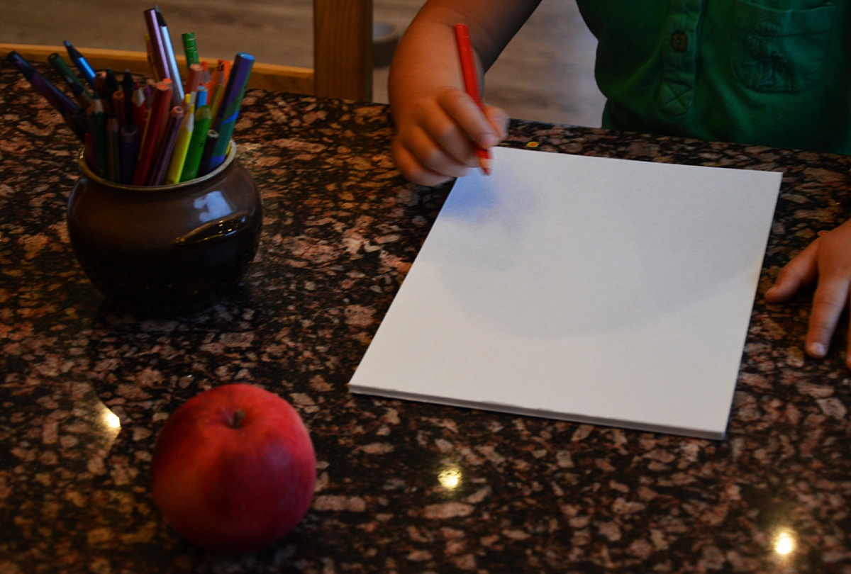 Beje mano vaikams „o“ – tai pirmiausia obuolys. Todėl ir paprašiau Emilijos nupiešti obuolį. Štai čia jos obuolio interpretacija...