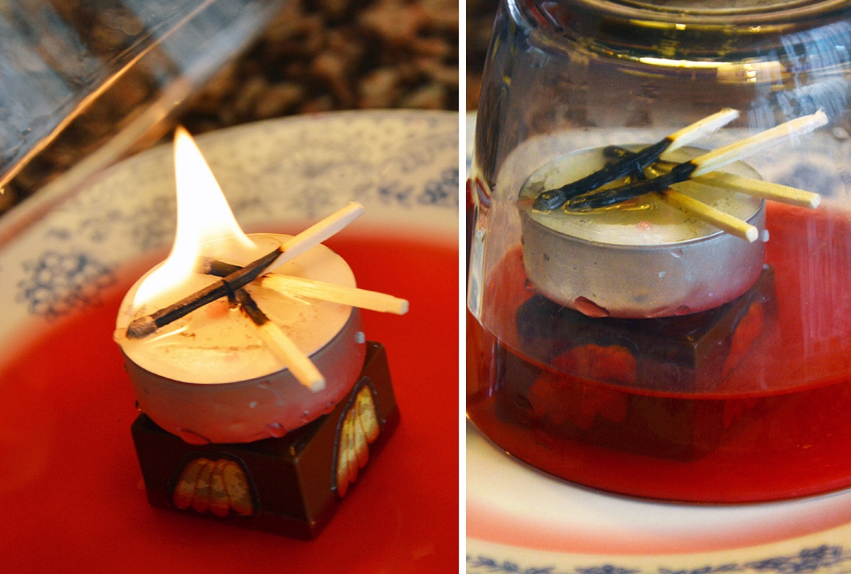 Ir tai dar ne viskas. Vieną popietę mus aplankė Agnė su vaikais. Ir Agnė parodė dar vieną esperiemento versiją. Reikia žvakės, stiklinės, lėkštutės su vandeniu (geriau spalvotu, kad geriau matytųsi). Žvakutę pastatom lėkštutėje su vandeniu, uždegam ir apvožiam stikline. Žvakė užgęsta, o vanduo sukyla į stiklinę. What?? Yup. Reikėjo matyti mano akių didumą... Be abejo, eksperimentą dar kartojom. Ir ne vieną kartą.