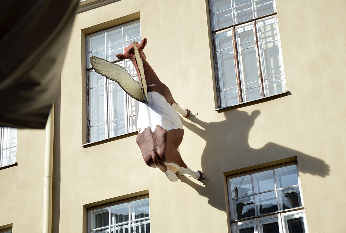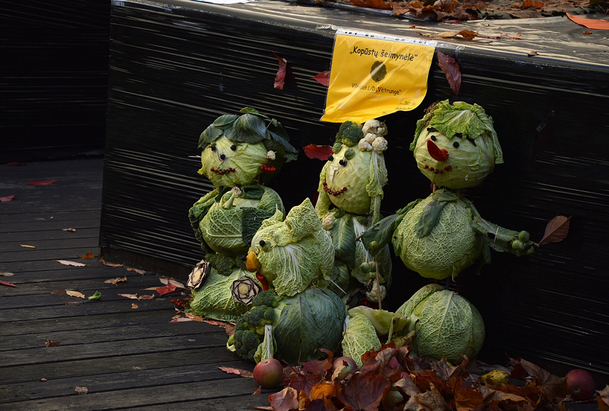 Vienas fiasko. Vieną dieną išvažiavau su vaikais į miestą. Pretekstas: nuvežti knygas į A.Mickeviačiaus biblioteką. Diena graži. Organizuota (visos knygos suruoštos, pietūs kaista orkaitėje). Vaikai puikiai nusiteikę, pamaitinti, aprengti, sušukuoti. Net ir Matui jau grįžta apetitas po paskutinių savaičių sirgimo. Viskas super. Važiuojam. Vilniečiai turėtų dabar iš manęs pasijuokti. Nesugalvojau, kur mašiną pastatyti, todėl pastačiau prie santuokų rūmų... tam, kad nueičiau į Trakų gatvėje esančią A.Mickevičiaus biblioteką. Na taip. Būna. Bet juk grynas oras ir mankšta dar niekam nepakenkė (ar ne?...). Na gerai, pasiekėm biblioteką. Prieš įeidami pakartojom bibliotekos lankymo taisykles: nusiimam batus (šitoje bibliotekoje reikia) ir pažiūrėję knygą padedam į vietą. Viskas praėjo sklandžiausiai – aš net raudonavau iš pasididžiavimo. Iš tos laimės ir džiaugsmo sugalvojau su vaikais nueit papietaut į Čili – maniškėms labai patinka lankytis kavinėse. Vaikai devintam danguj. Pakeliui užsukom į mokytojų kiemelį, kur netikėtai aptikome keistą daržovių skulptūrų parodą. Vaikai buvo sužavėti... ypač skraidančia karve, kuri pavargo ir nutūpė ant sienos.