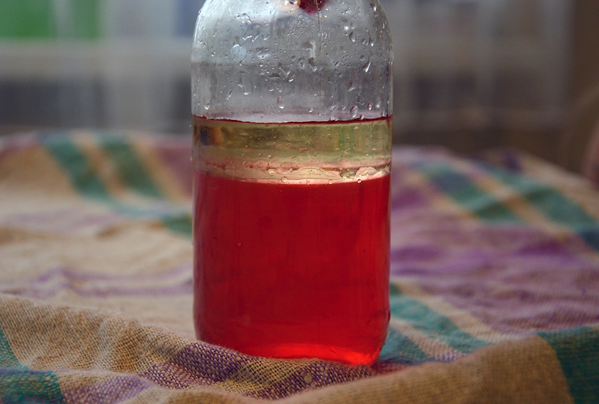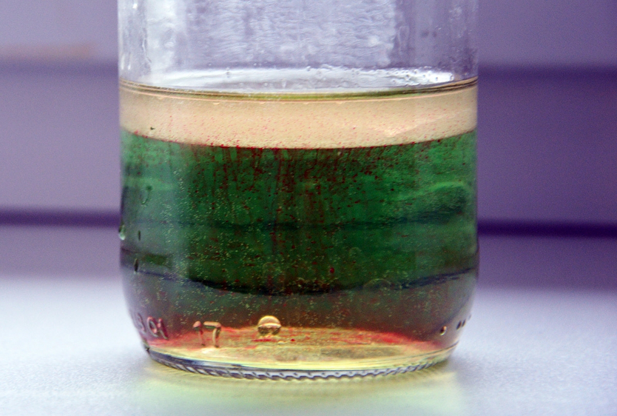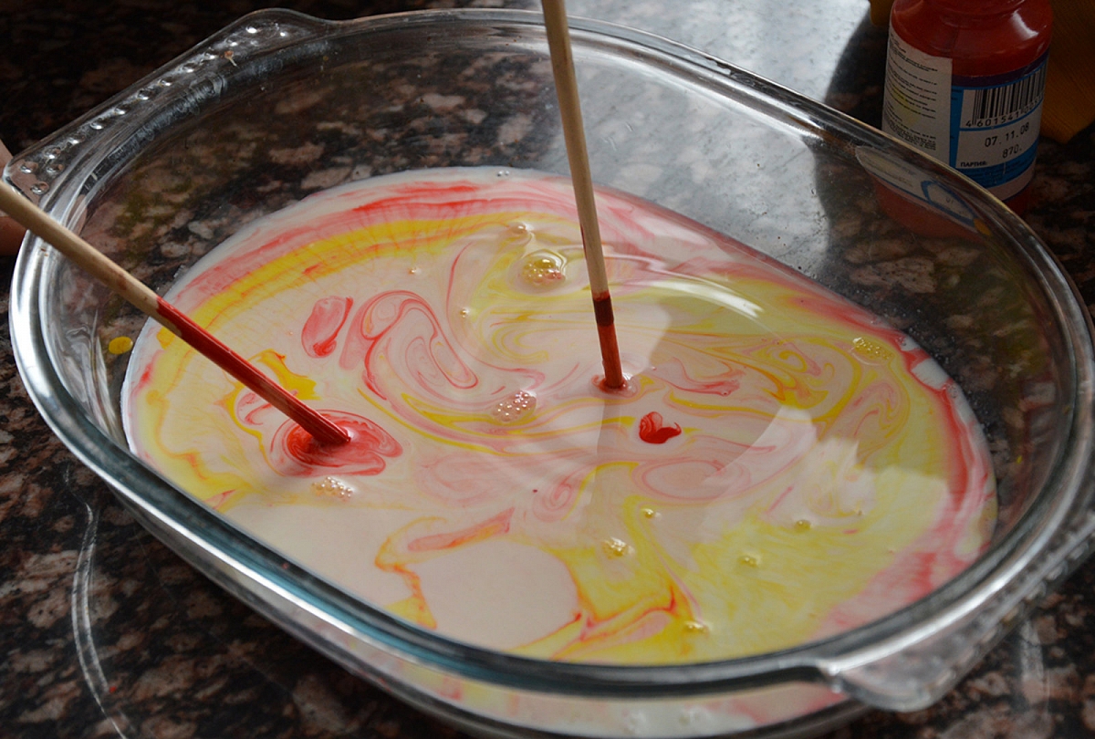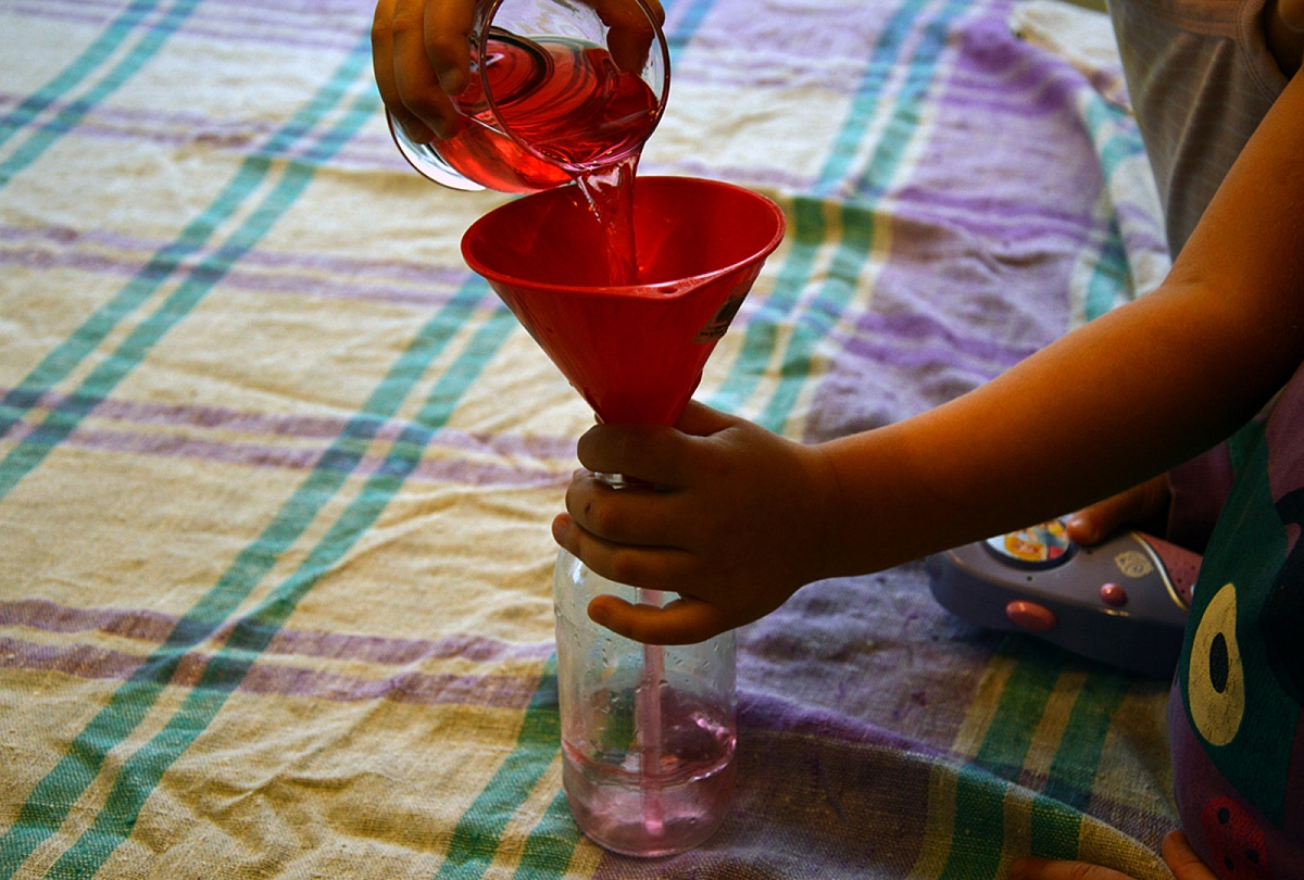 Visokie dėsniai ir ko. Ir tai dar ne viskas. Žaidėm su skysčiais, stebėjom kaip jie maišosi... o tiklsiau kaip nesimaišo. Į stiklinį indą pripylėm vandens (specialiai parinkau buteliuką siauru kaklu, kad vaikai turėtų progos pažaist piltuvėliu), įpylėm maistinių dažų. Stebėjom, kaip vanduo nusidažo. Tuomet į puodelį pripylėm aliejaus. Įpylėm maistinių dažų į aliejų. Stebėjom, kas bus. Žinoma, aliejus nenusidažė, o dažai išsiskaidė į mažyčius lašelius. Tuomet supylėm aliejų į vandenį. Kadangi aliejus lengvesnis, jis iš karto iškilo į paviršių ir susiliejo į vieną sluoksnį. O kas nutiko su dažais!? Aha! Dažų lašeliai ėmė skverbtis į vandenį. O kadangi į aliejų pylėm kitą spalvą, gavom puikų reginį: iš aliejaus debesies į vandens jūra srūvantis lietus. Pasidžiaugę audra stiklinėje, įbėrėm sodos, užpylėm acto. Nepasakosiu kas atsitiko – pabandykit patys. Eskperimentą kartojom kelis kartus – užskaitau.