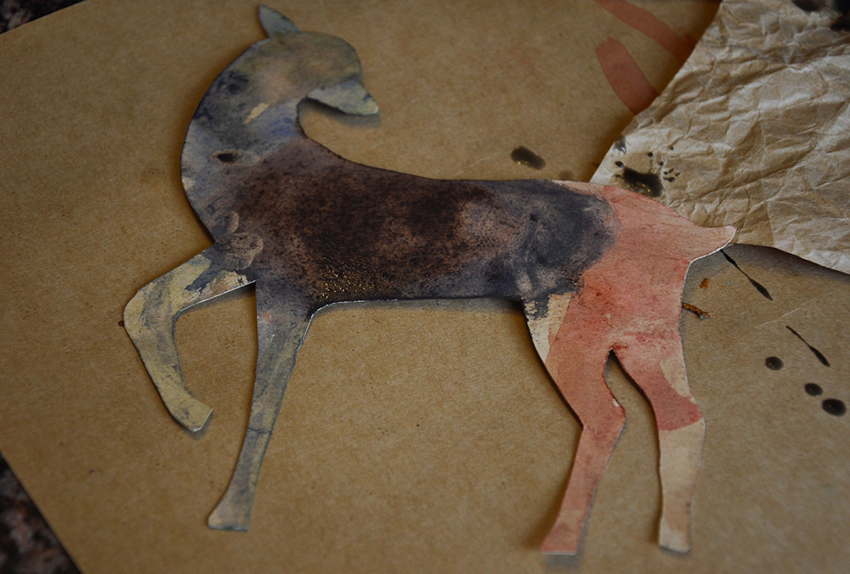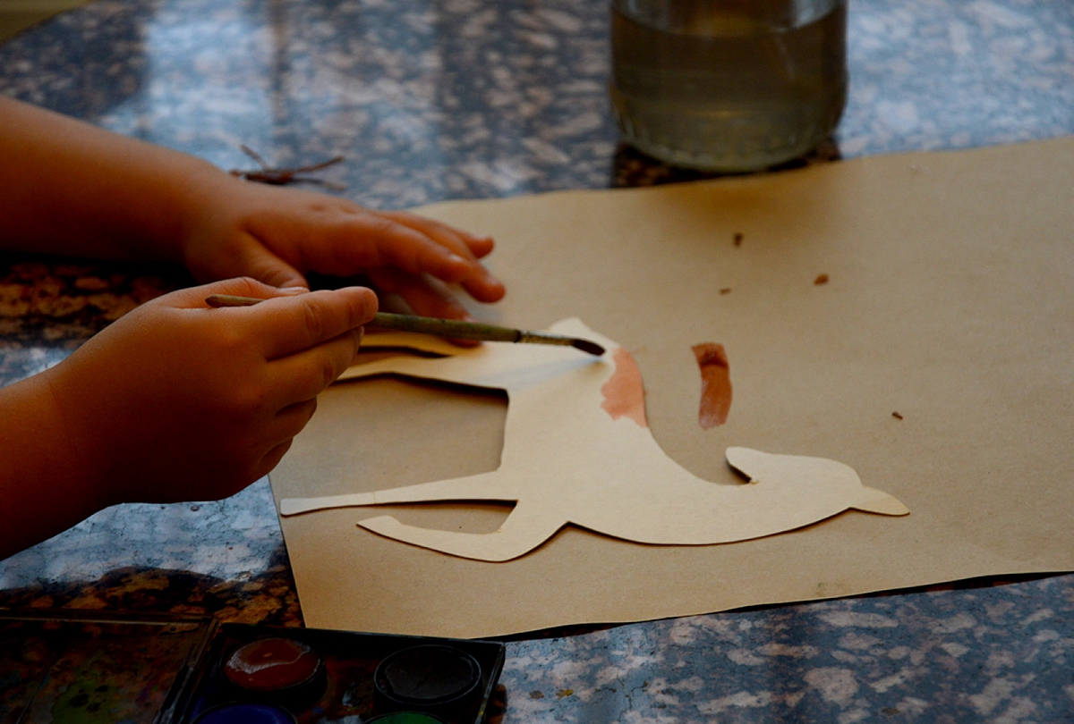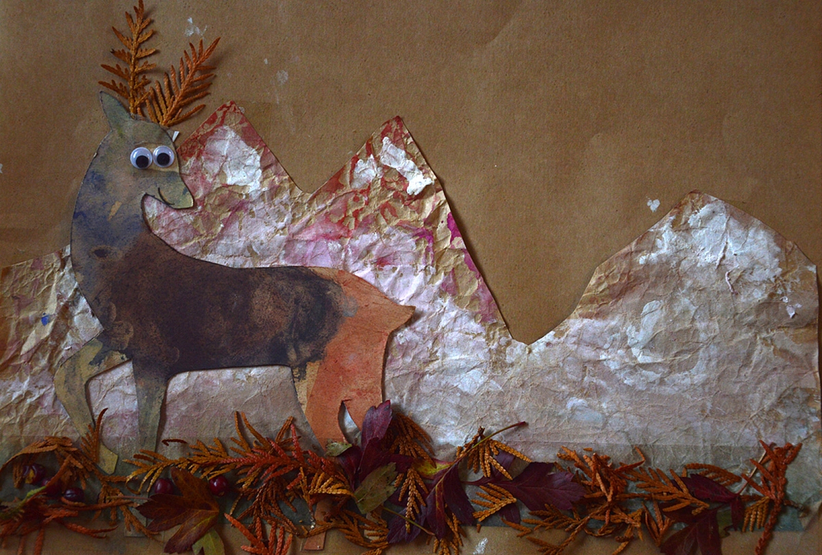Elniai. Taip pat darėm dar vieną daug kantrybės ir pasiryžimo pareikalavusį darbelį. Nuotraukos apačioje. Atsispausdinau elnio siluetą, perpiešiau jį ant storesnio popieriaus. Vaikai spalvino savuosius elnius (vis pasižiūrėdami į nuotrauką kompiuteryje). Sofija nusprendė daryti elnią su ragais, o Emilija – stirną. Paruošę elnius, ėmėmės kalnų (prieš tai peržiūrėjom įspūdingų kalnų nuotraukas). Sofijos kalnai žydi rausvomis gėlėmis ir yra visi nukloti sniegu – pati sugalvojo, neleido man nė piršto prikišt. Emilijos kalnai žalsvi, snieguotom viršūnėm. Tuomet viską suklijavom ant popieriaus (taip, čia manoji dalis), papuošėm gudobelių lapais ir nupurškėm lapus laku. Voila.