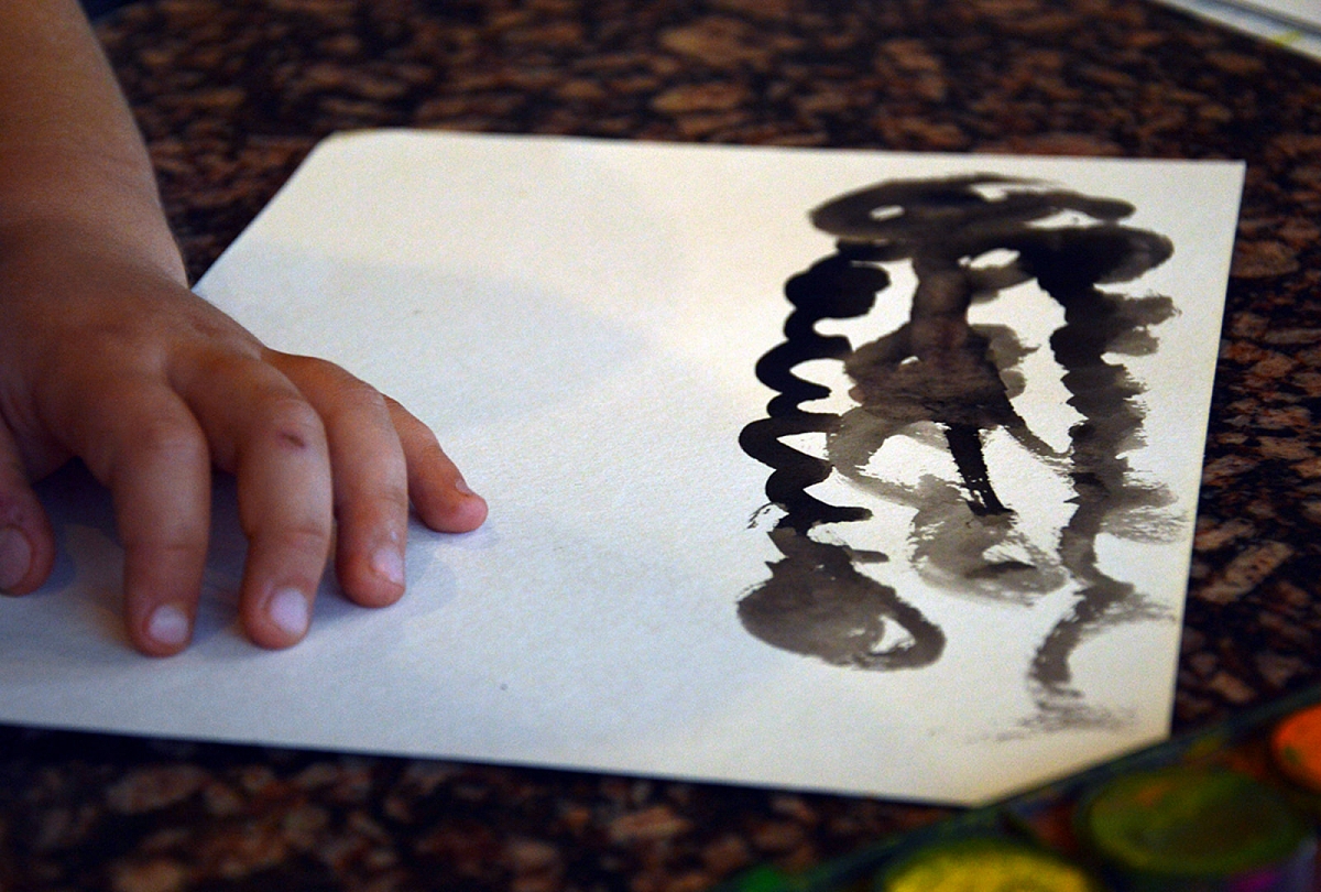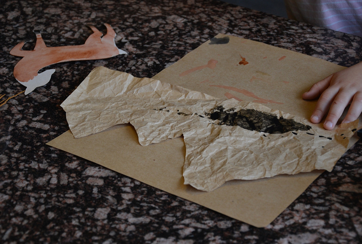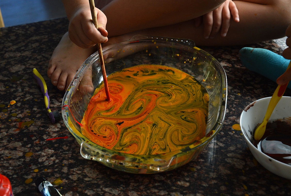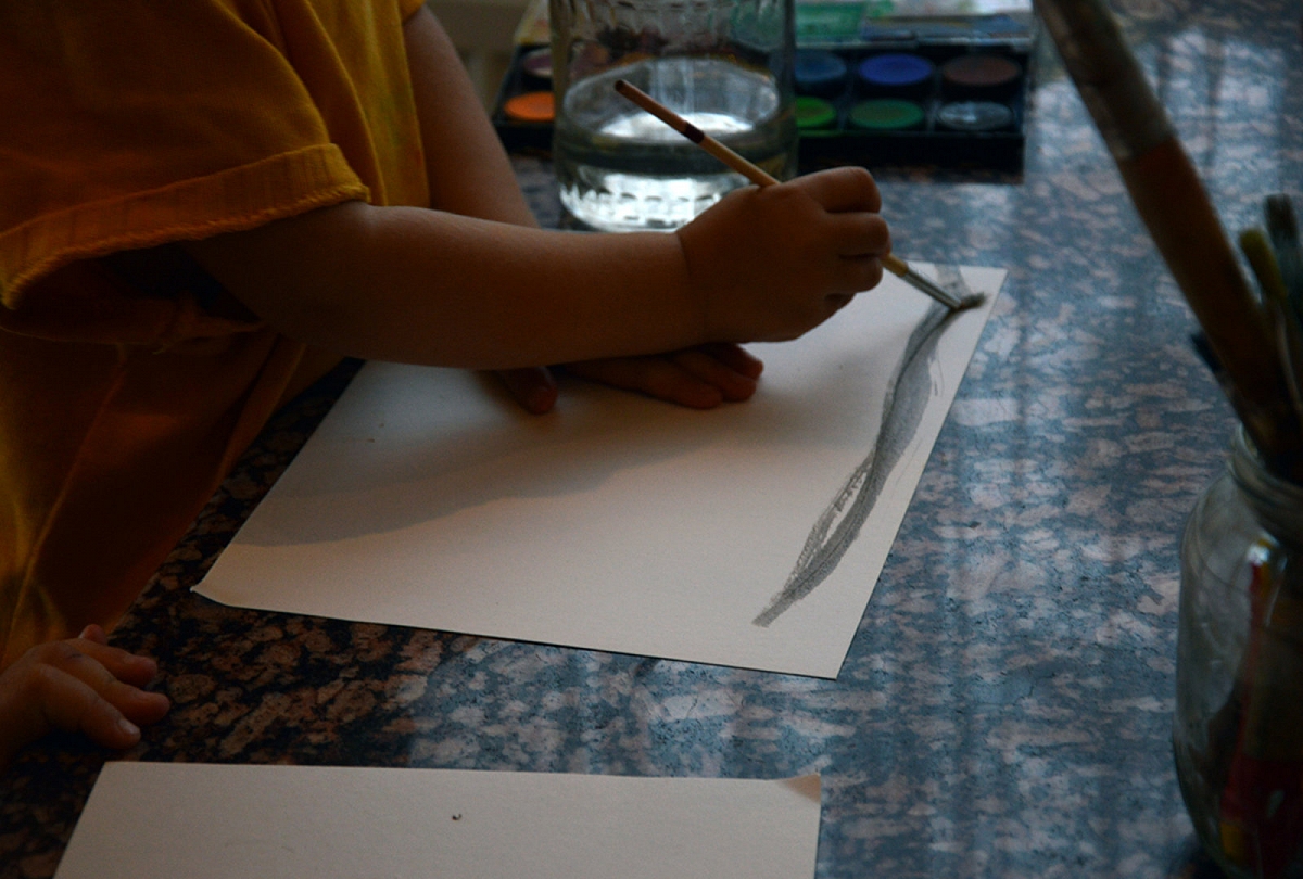 Dailė. Taigi kūrėm. Bandėm gaminti marmūrinį popierių (angl. marble paper). Į plokščią indą pripylėm pieno. Ant pieno paviršiaus liejom dažus (svarbu jų nemaišyti!) ir merkėm į jį popierių. Gavosi iš kelių bandymų (labai svarbu popieriaus nemirkyti, o delikačiai įmerkti paviršiumi). Tik paskui vaikai neteko kantrybės, ir baltas pienas pavirto purvina makaloše. Popierių padžiovinau ir suspaudžiau tarp knygų. Tuomet apie jį pamiršom. Prisiminėm tik savaitgalį. Emilija prašė iš jo prikarpyti drugelių, o pati bandė sumeistruoti ryklį...