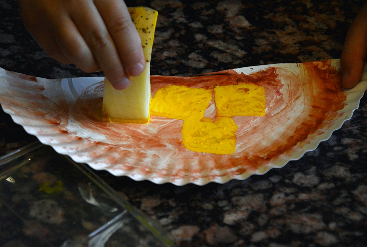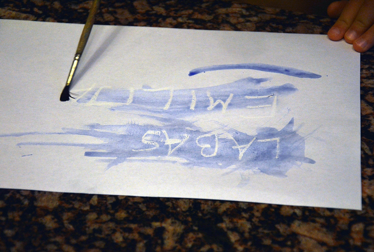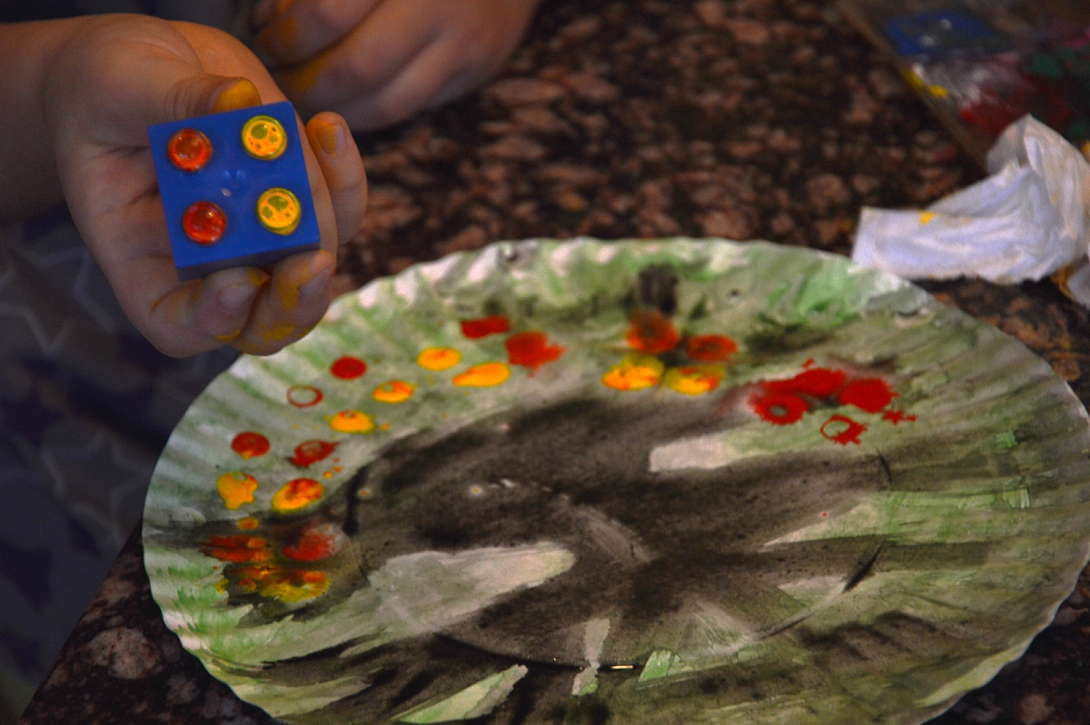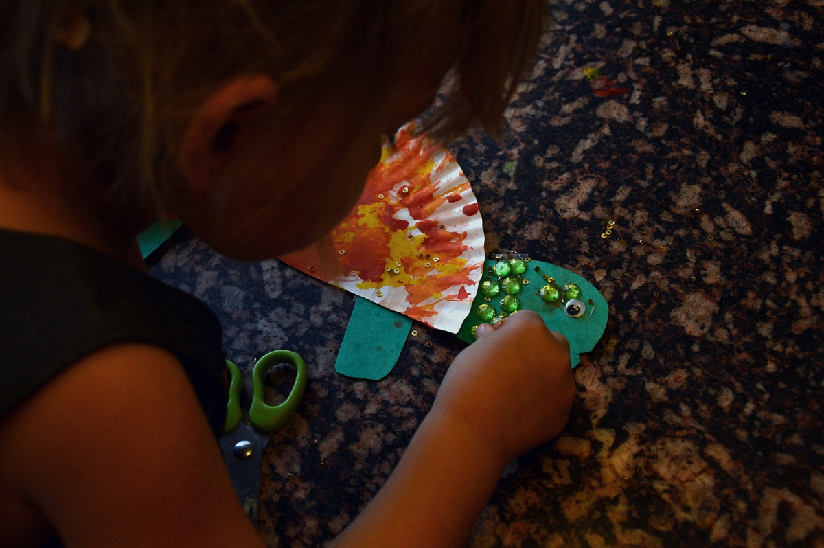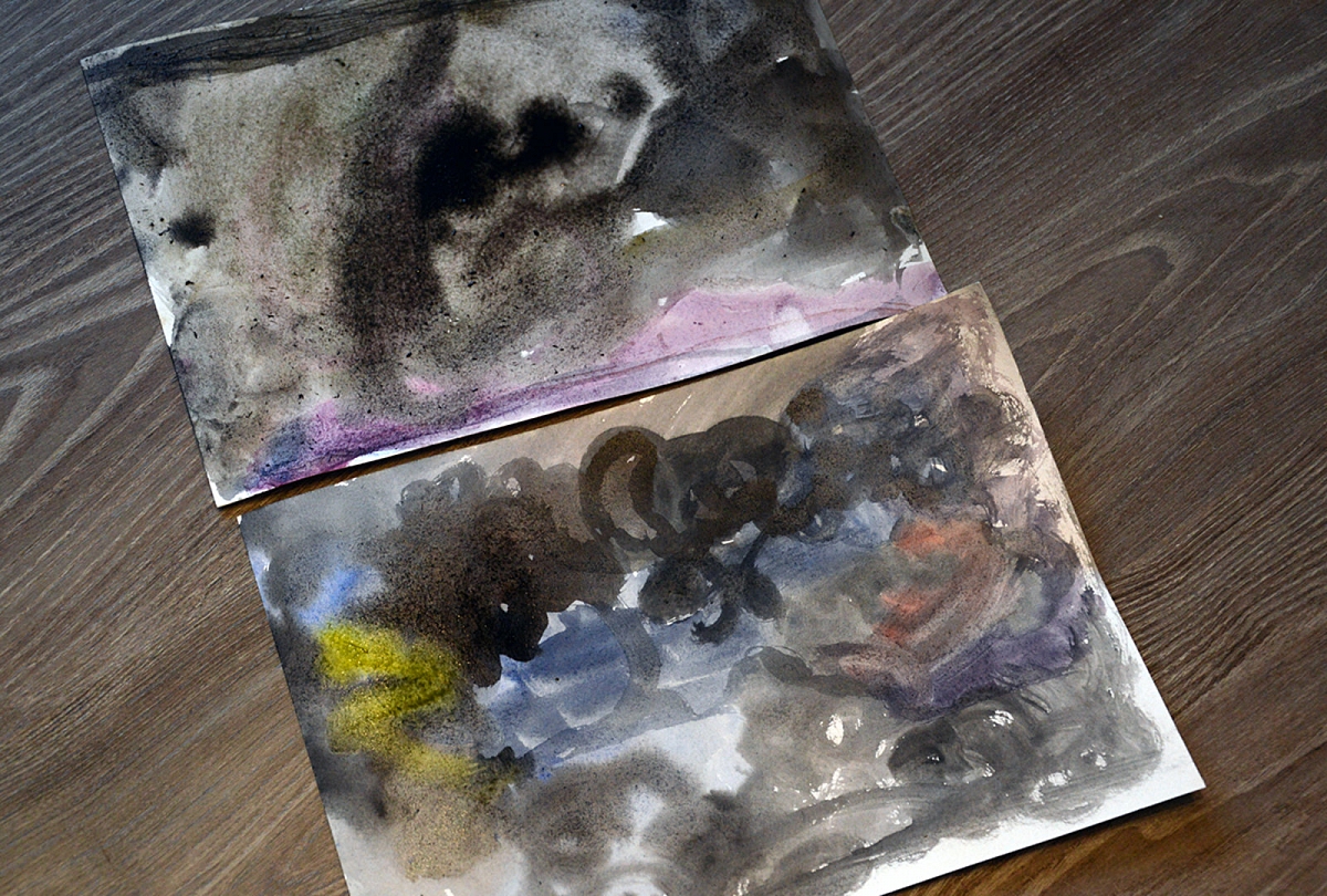 Dailė. Taigi kūrėm. Bandėm gaminti marmūrinį popierių (angl. marble paper). Į plokščią indą pripylėm pieno. Ant pieno paviršiaus liejom dažus (svarbu jų nemaišyti!) ir merkėm į jį popierių. Gavosi iš kelių bandymų (labai svarbu popieriaus nemirkyti, o delikačiai įmerkti paviršiumi). Tik paskui vaikai neteko kantrybės, ir baltas pienas pavirto purvina makaloše. Popierių padžiovinau ir suspaudžiau tarp knygų. Tuomet apie jį pamiršom. Prisiminėm tik savaitgalį. Emilija prašė iš jo prikarpyti drugelių, o pati bandė sumeistruoti ryklį...