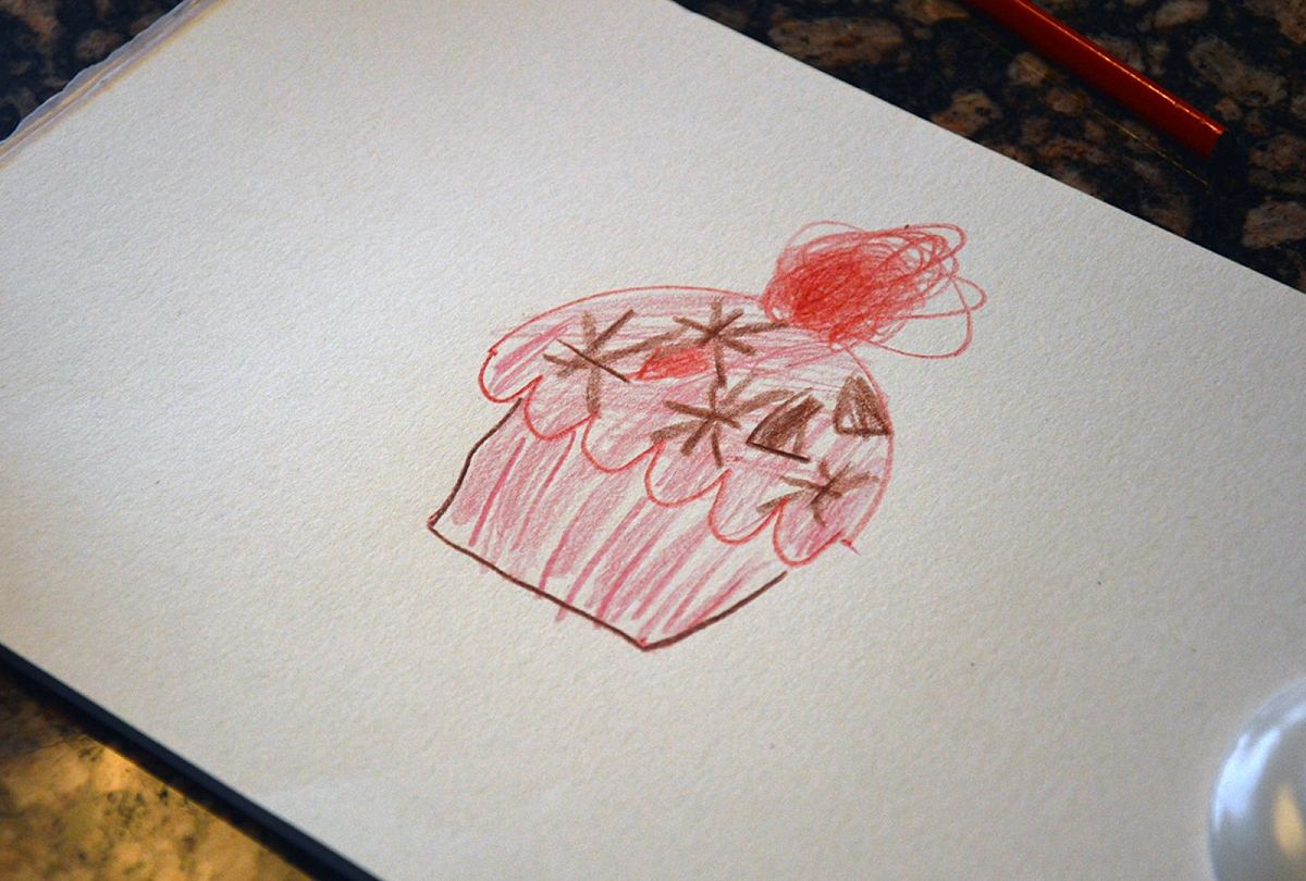 Kokių spalvų pavadinimai prasideda R raide? Rožinė, raudona, ruda. Uždaviau vaikams nupiešti piešinį tik su šiomis spalvomis. Tad piešėm keksiukus. Emilija ištikimai improvizavo tik su šiom spalvom. Tik ant pačio galo neišlaikė ir nupiešė juodas aguonas, o Sofija užduoties nepaisė, tačiau keksiukus piešė net liežuvį iškišus.