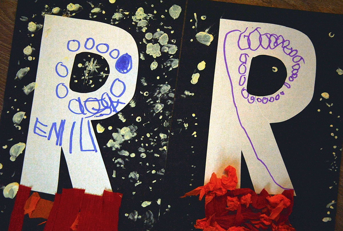 Raidės. R. Taigi ramybė. Apie tai jau nupasakojau. Dar ropliai. Visai netikėtai pasimaišė mums šitas žodis. Nuo to laiko, kai padarėm povą, Sofija vis prašė pasigaminti vėžlį. O aš ėmiau mąstyti, kaip čia galima būtų vėžlį surišti su R raide. Ir surišau: roplys, ropoja. O kad vėžliui nebūtų vienam liūdna, į kompaniją jam pasikvietėm ir kitas reptilijas: driežą, gyvatę, chamelioną, krokodilą.. Vėžlį ir gyvatę gaminomės, apie krokodilą skaitėm, apie driežą man pasakojo patys vaikai (kaip jam nukrenta uodega ir pan). Na o su chameolionu padraugauti nespėjom, bet tikrai jį dar prisiminsim kitą savaitę – radom baisiai smagų darbelį... negalim nepadaryti.