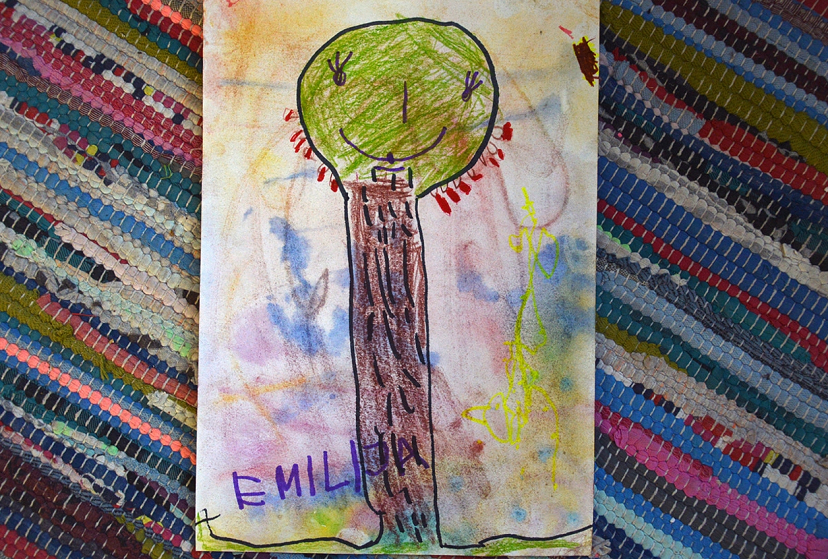 O čia Emilijos dovana mūsų pastoriui. Foną liejo pati. Medį piešė pati. O gale dar paprašė, kad užrašyčiau eilutę iš Biblijos (Psalmių 1). Sunku man buvo skirtis su piešiniu, bet dovana yra dovana.