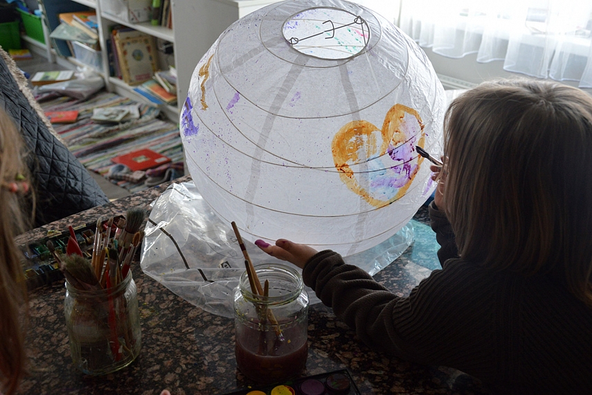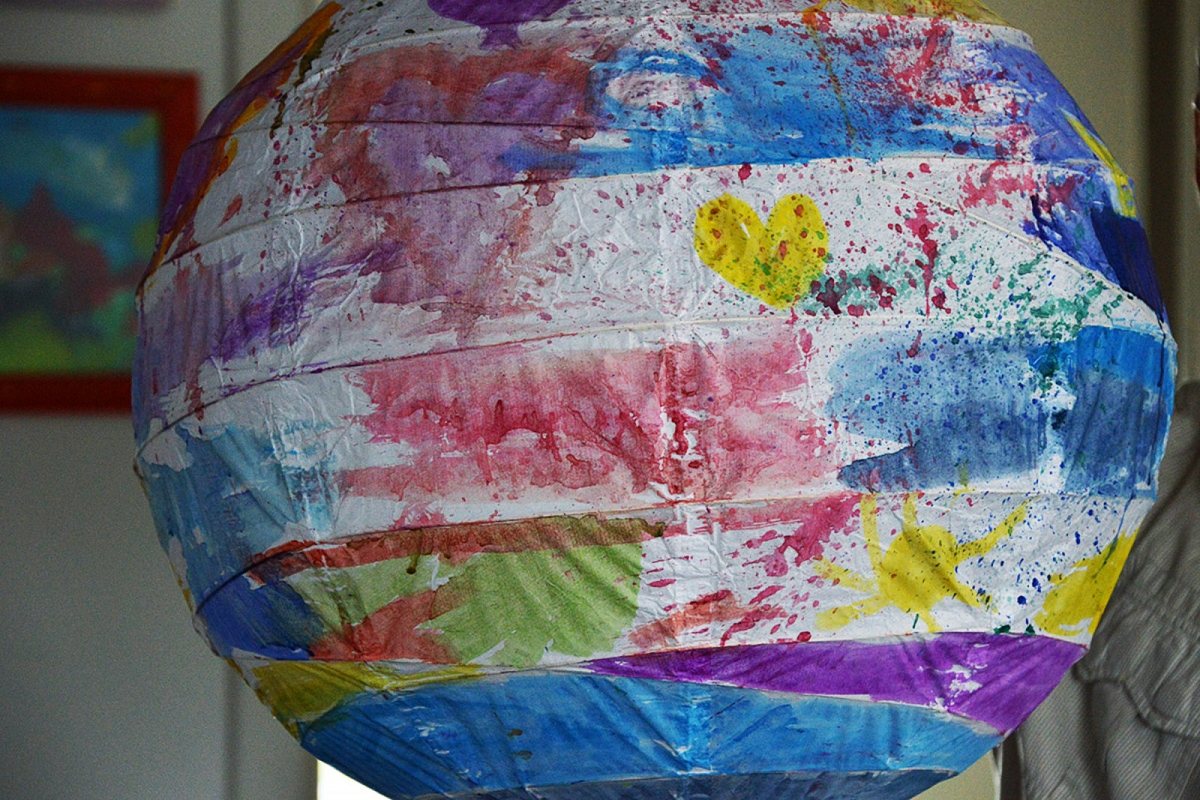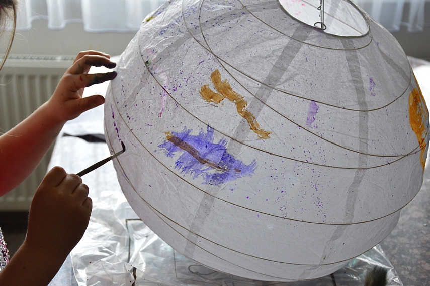 Ir truputi arčiau žemės... Pavasario tvarkymosi proga su vaikais keitėm mūsų miegamojo lempos gobtuvą. Praeitais metais taškiausi su dažais ir vaikais (o gal vaikais ir dažais) lauke; šiemet tą patį pakartojom virtuvėje... Hm. Tą aptaškytą praeitų metų gobtuvą išmetėm ir ėmėmės naujo (beje tokį baltą galima labai pigiai nusipirkti IKEA... vienas pastebėjimas: stenkitės naudot mažiau vandens, daugiau dažų... ir netrinkite vienoj vietoj, nes galit pratrinti skylę).