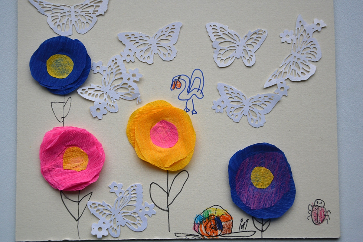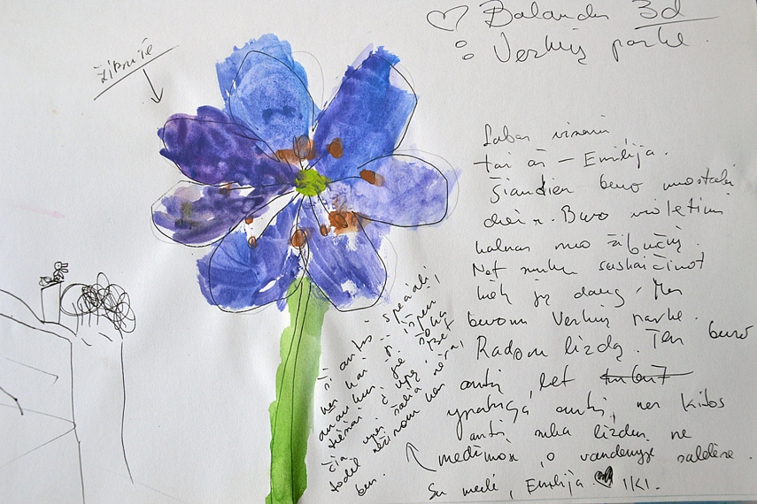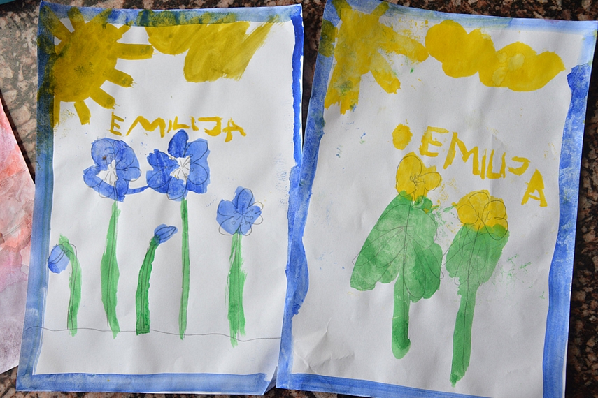 Tad galima įsivaizduoti, kiek laimės buvo vaikams pamačius pirmąsias žibutes. O vėliau ir geltonas gėlytes (kurios taip pažįstamos iš matymo... tik pavadinimo vis neprisiruošiu susirasti). Tad ne tik skynėm, bet ir piešėm gėles bent kelis kartus.