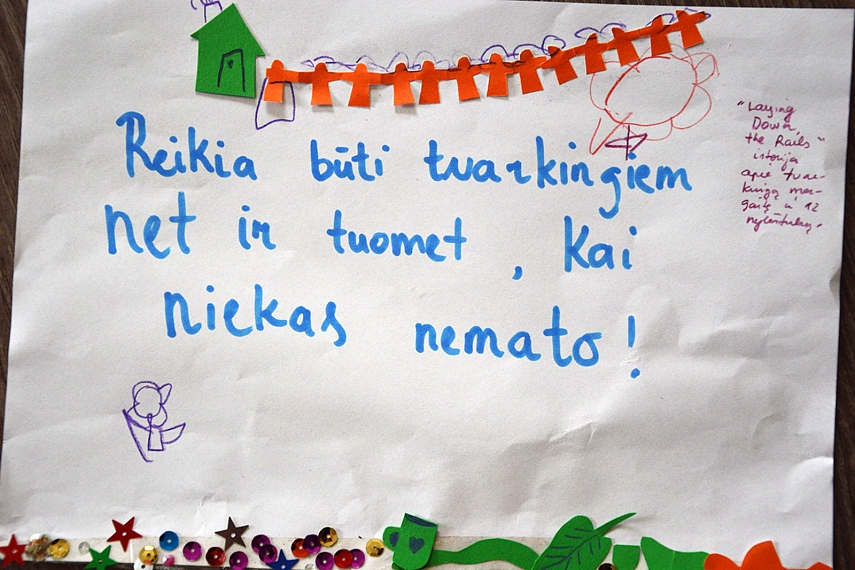 Dėl tvarkymosi reikalai juda lėčiau, bet vaisiai jau yra: prieš kelias dienas Emilija, sužinojusi, kad popiet atvažiuos svečių, griebė Sofiją už parankės ir nusitempė į kambarį. Ten girdėjau, kaip mokė jaunesnę sesutę: „Sofija, reikia tvarkytis kambarį, nes atvažiuos svečiai“. Beveik neblogai. Vieną dieną skaitėm vieną istoriją iš jau minėtos knygos, kuri moko vaikus, kad tvarkingais reikia būti net ir tuomet kai nieks nemato (suprask – ir tuomet, kai neatvažiuoja svečiai). Tad likusias savaites noriu koncentruotis į tai, jog būti tvarkngam nėra našta, o atvirkščiai – palaiminimas. Ir kad užmigti vakare, o ryte atsikelti tvarkingame kambaryje yra malonu. Žodžiu, paslaptis, manau, slypi tame, kad reikia formuoti ne išorinius įpročio dalykus (na, tiesiog išmokint vaiką tvarkyti kambarį), o eiti tiesiai prie vaiko širdies. Tad ne „kaip tvarkytis“, o „kodėl tvarkytis“. Tai vat ties tuo ir koncentruosiuos ateinančias tris savaites.