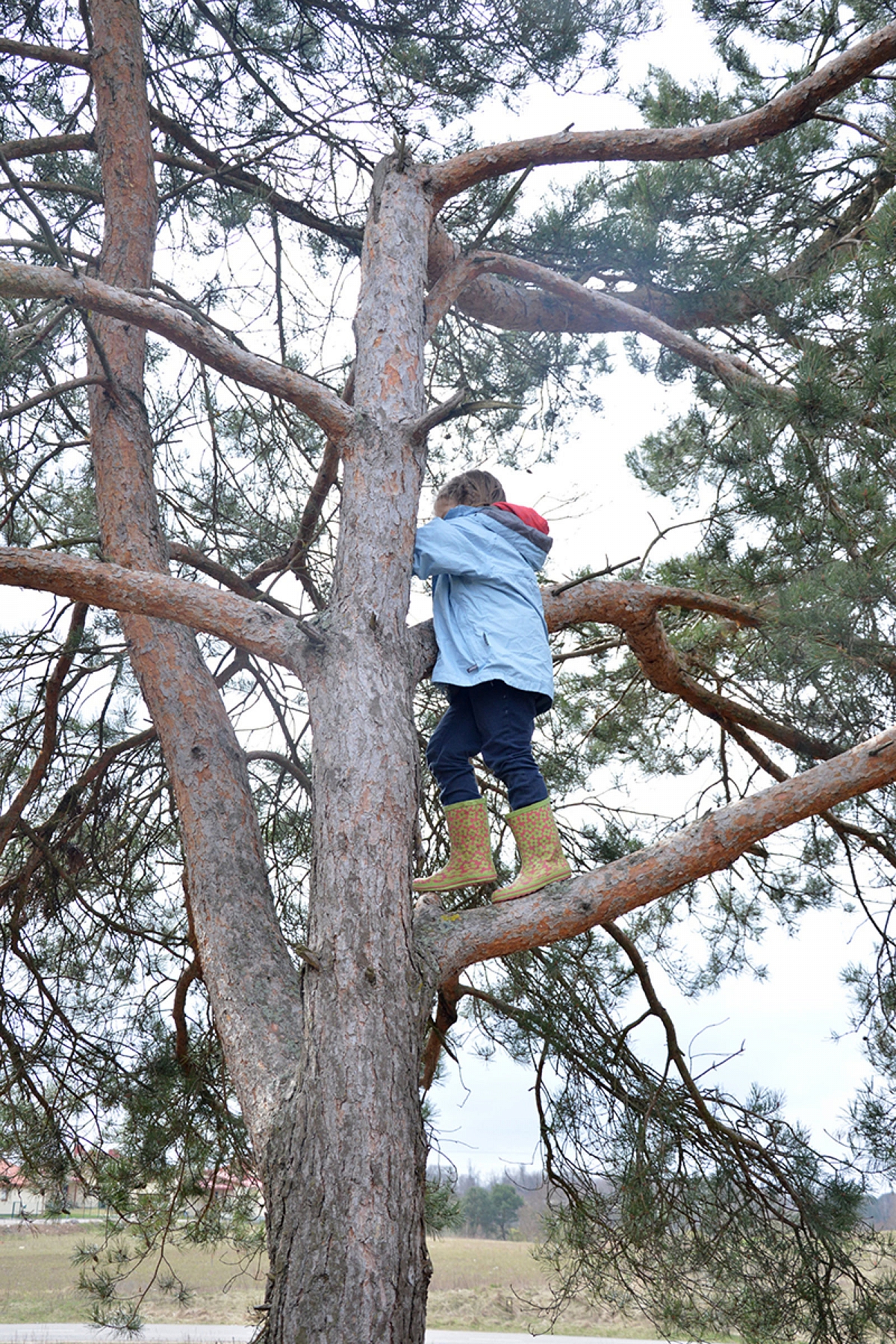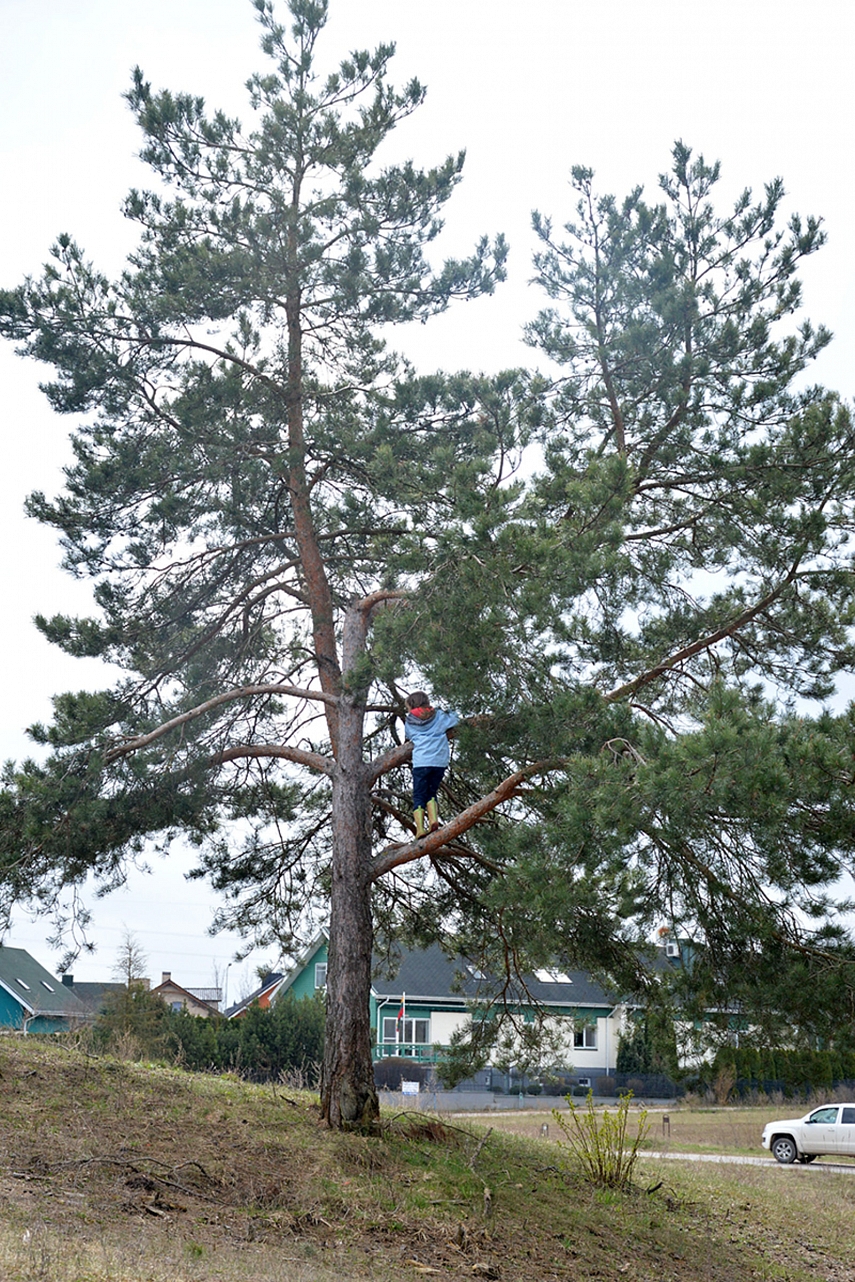 Lauke irgi atradom naują užsiėmimą - laipiojimais medžiais. Emilija jau įveikė visas sodo obelis ir visus įveikiamus kaiminystės... krūmokšnius. O tai čia ir jos naujausias pasiekimas. Žinoma, šį kart be pagalbos neapsiėjo.
