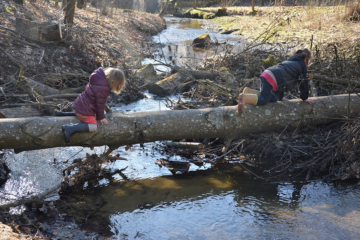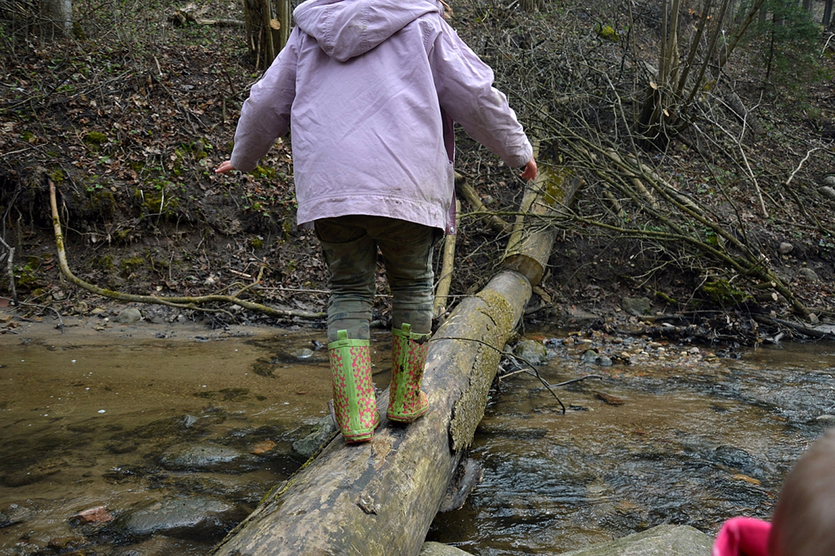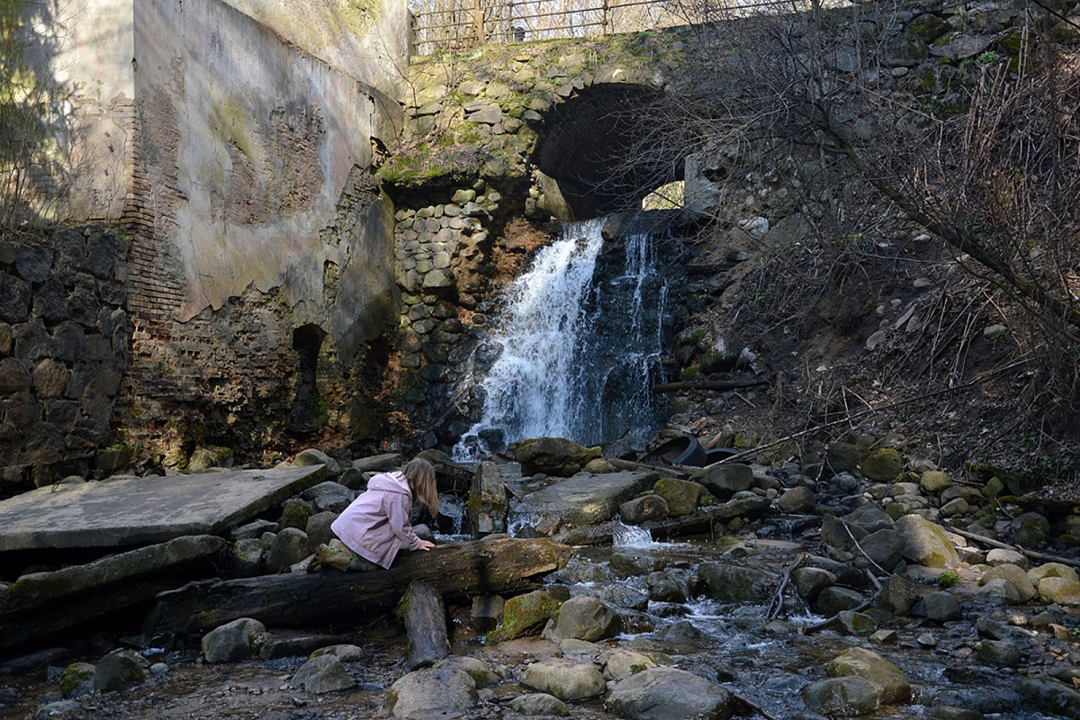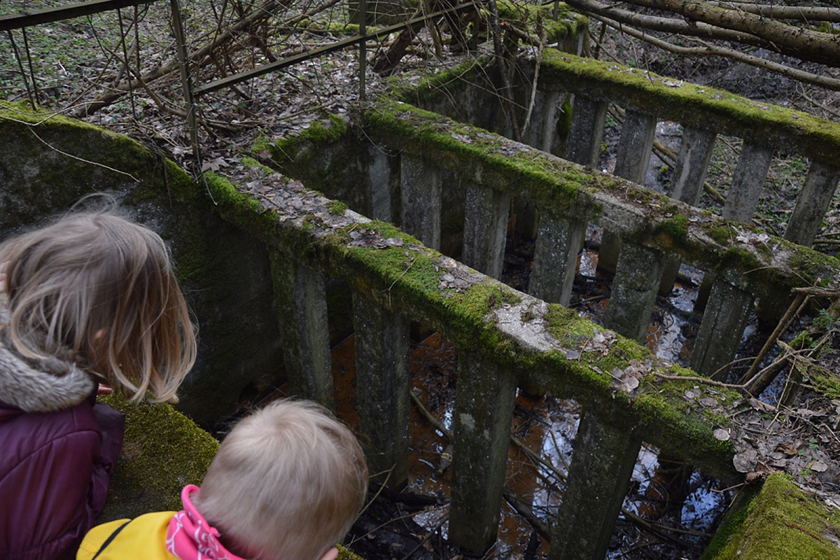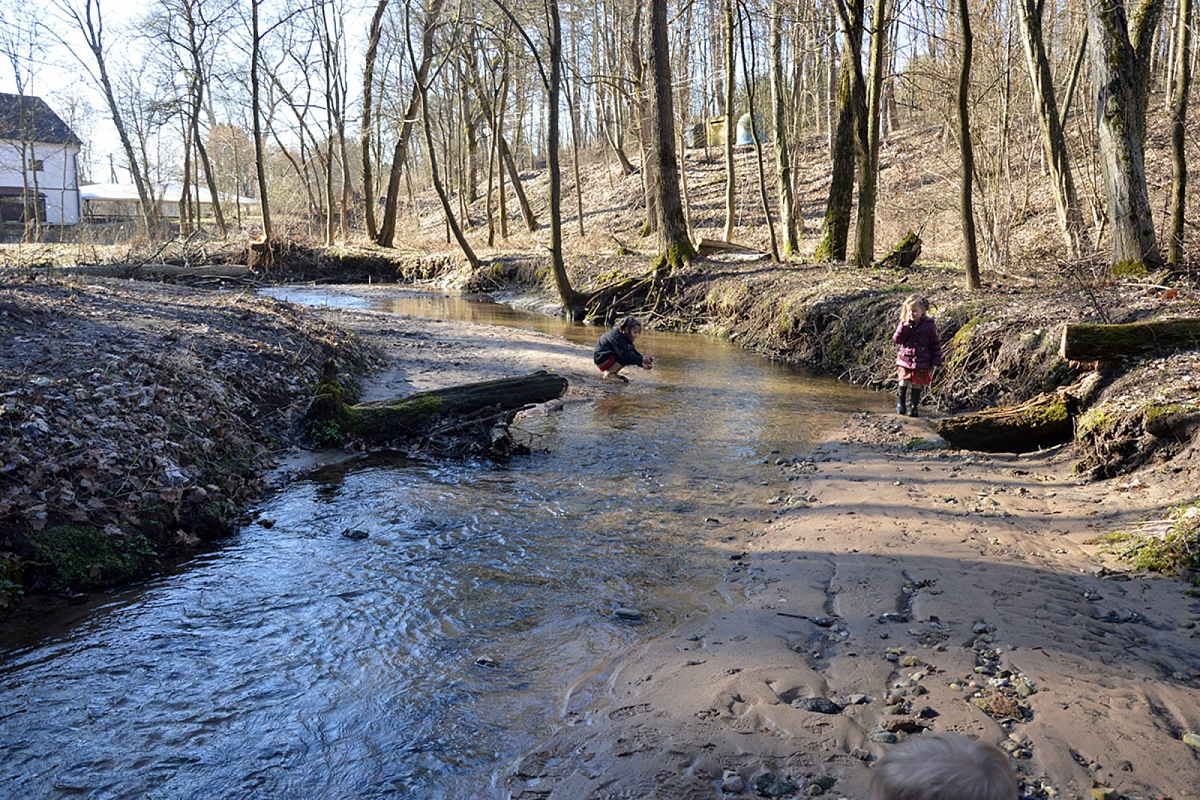 Prie Verkių malūno vaikams nuotykių netrūko. Visi užsimovėm gerus aukštus guminius batus ir pirmyn į vandenį. Vietomis upelis gana sraunus, o akmenys slidūs, tad nors ir negilu, bet azartas vaikams kyla. Vienur vandens vos iki kulnų, kitur – žiū jau virš guminių. Tad buvo visko – ir šleptelėjimų į vandenį, ir vandens guminiuose... Bet svarbiausia, kad buvo smagu.