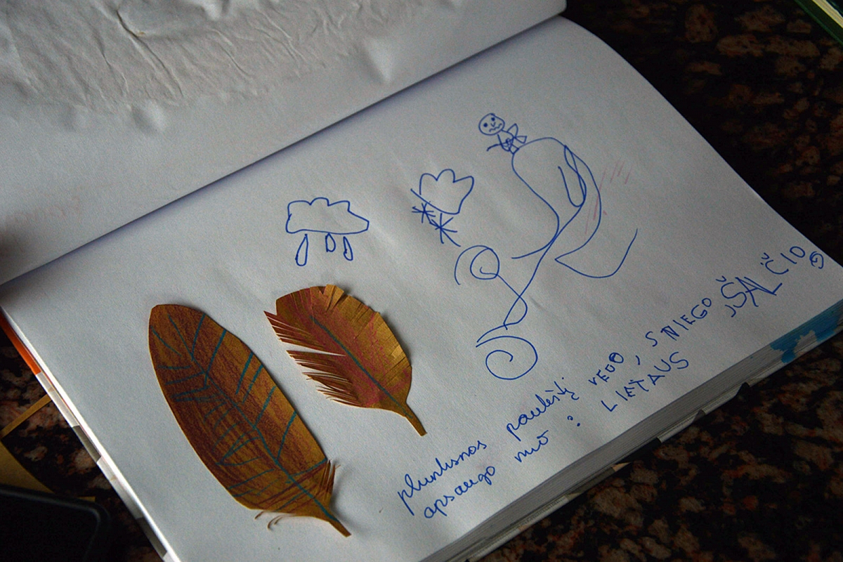 Ką gi mes vėikėm? Visų pirma: truputis teorijos. Kadangi visą žiemą ir dabar ankstyvą pavasarį pro savo langą stebėjome paukščius, nusprendžiau kiek pagilint mūsų turimas žinias. Kalbėjom apie plunksnas: kokios jos būna (viršutinės – skraidymui, pūkai – šilumai), kaip jos sugula ant kūno (kaip stogo čerpės) ir kam jos reikalingos (apsauga nuo šalčio, vėjo, lietaus; papuošimas). Pagaliau išsiaiškinau ir aš pati, kodėl patinėliai yra margesni už pateles. Kad prisiviliotų geriausią patelę – tai čia viena. Bet yra ir kita medalio pusė – kad apsaugotų patelę bei lizdą su jaunikliais (kai pajunta pavojų, patinas būdamas ryškesnis ir geriau pastebimas stengiasi nukreipti medžiotojo ar plėšrūno dėmesį nuo patelės bei lizdo). Atrodytų tik teorija, ane? Bet taip nėra. Emilijai visa informacija kuo puikiausiai susigulėjo galvoje ir kitą kartą, skaitant istoriją apie laukines antis, ji jau turėjo ne vieną progą pritaikyti neseniai įgytas žinias.
