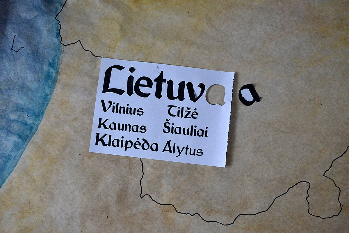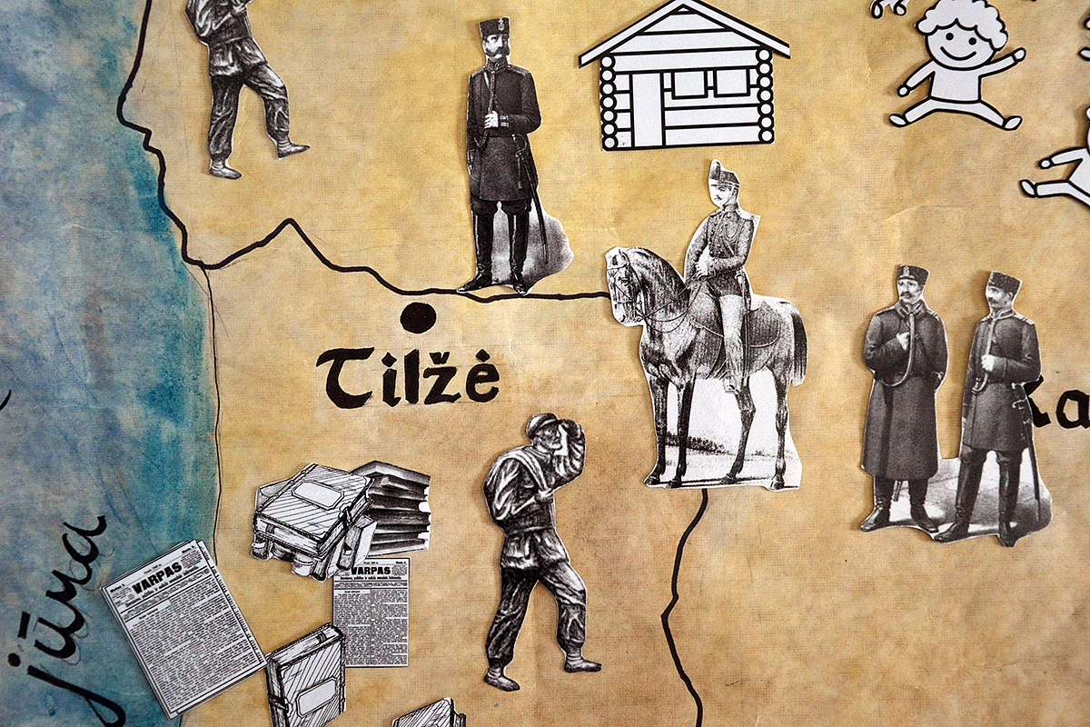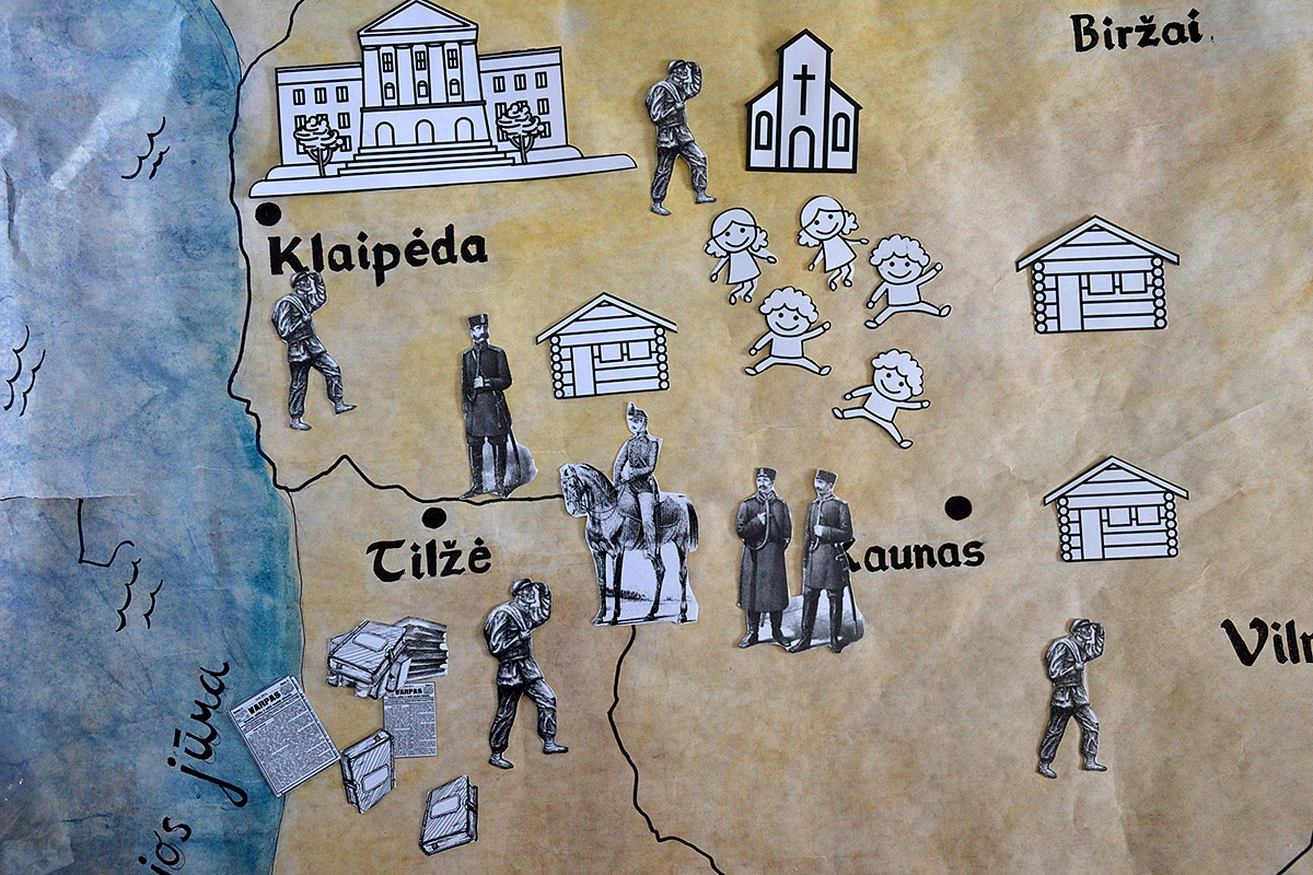 Atkreipti vaikų dėmesį į Lietuvos sienas, apvedžioti jas pirštu. Demonstruoti ir paaiškinti: "Viduje yra Lietuva, čia spausdinti knygų negalima. Štai čia (parodyti teritoriją už sienų) yra ne Lietuva - čia spausdinti knygas galima. Tačiau, kaip gi jas pargabenti į Lietuvą?". Parodyti vaikams Tilžę, paaiškinti, kad čia buvo spausdinamos lietuviškos knygos, bet pernešti jas per sieną buvo neįmanoma, nes sienas saugojo to meto policija - žandarai (sudelioti figūrėles ant žemėlapio).