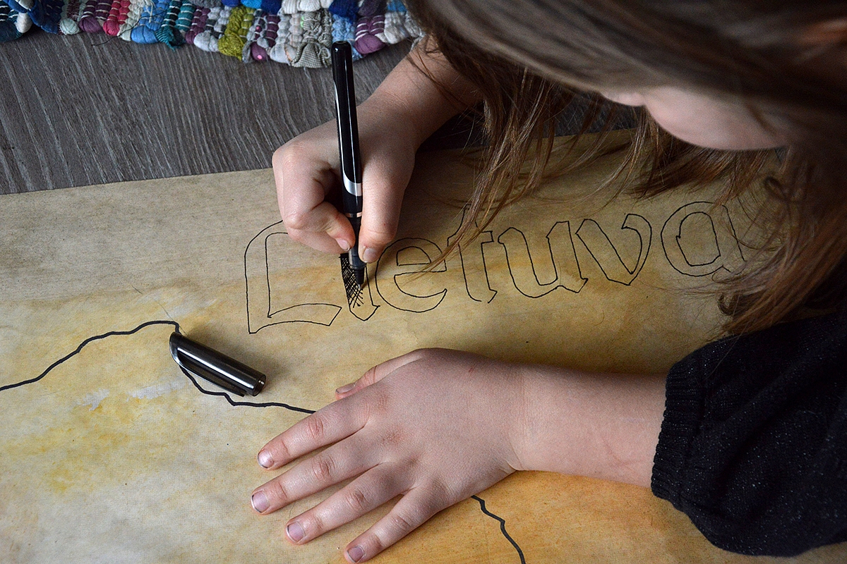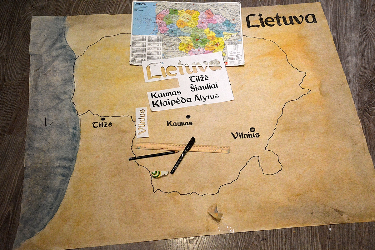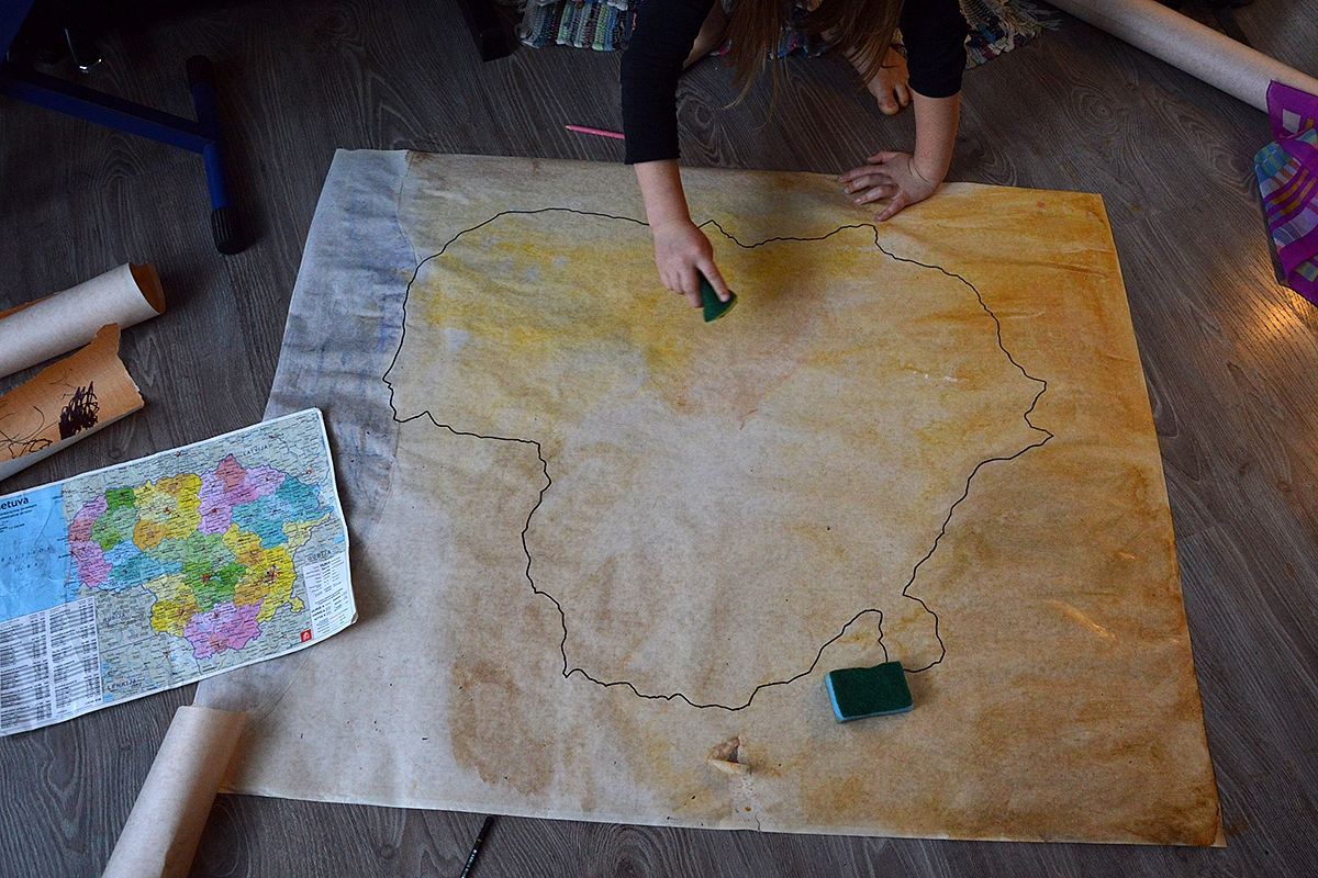 Dar pačioje pradžioje, kai pradėjau dėliotis pristatymo gaires, supratau, kad be didelio (ir neapkrauto) Lietuvos žemėlapio - nė iš vietos. Teko piešti. Bet štai sugalvojom su Emilija ir atrakciją - pasigaminti kiek pasendintą žemėlapį. Tam pagelbėjo indų kempinėlės ir švelnūs akvareliniai dažai. Nereikia turbūt net sakyti, kad smagiausia žemėlapio ruošimo dalis buvo būtent ši. Viską kitą užbaigiau aš, nes Emilijai deja neužteko kantrybės, o aš negalėjau nugalėti savo perfekcionizmo ir leisti jai spalvinti miestų pavadinimus, todėl kompromisas geras - ji kartu "sendino" popierių, spalvino jūrą bei ryškino sienas, o aš padariau visą kitą.