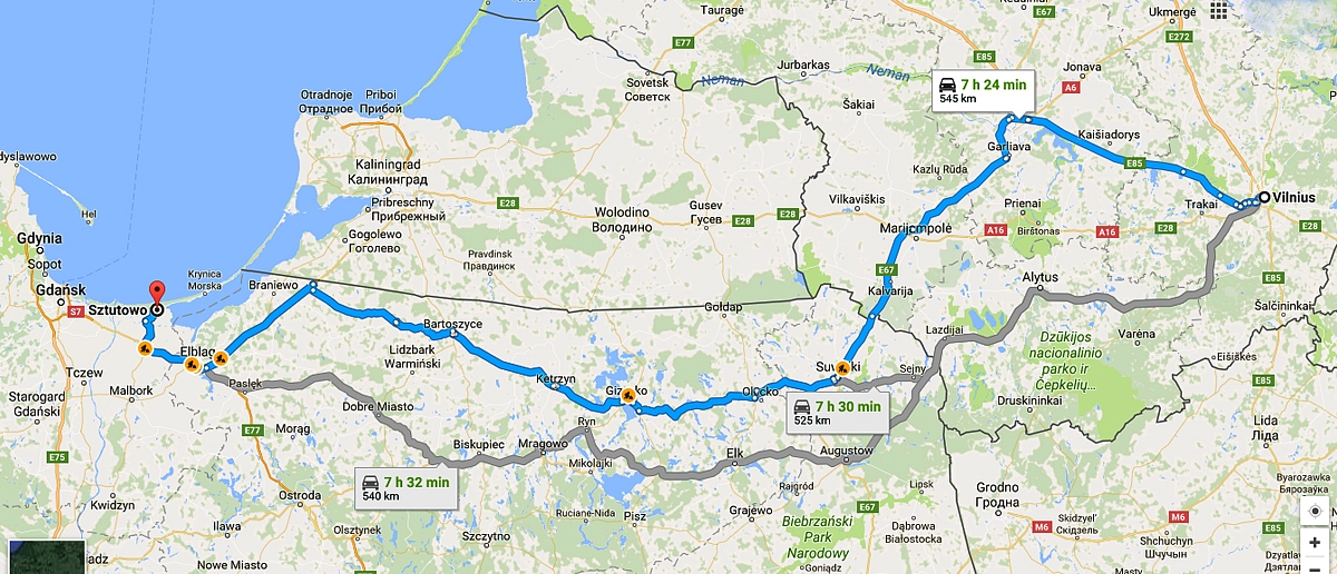Taigi, viską apskaičiavus, susidėjo, kad iš Vilniaus išvykti turime 5:00, nes taip laimėtume 3h vaikų miego. Google žemėlapyje susideliojau tokį kelio maršrutą: Vilnius-Kaunas-Marijampolė-Kalvarija-Suvalkai-Oleckas-Gizycko (liet.Lėcius)-Bartoszyce-Elblag-Sztutowo.