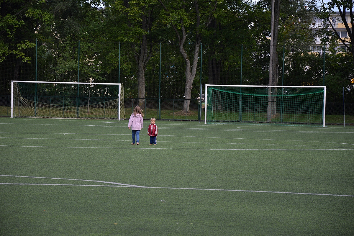 Iki Suvalkų reklamos beveik vien lietuviškos. “Pirkit pigiau. Pirkit daug. Urmu. Pirkit dabar. Rytoj bus per vėlu”. Na iš tos serijos. Gerai, kad pravžiavus Suvalkus visos lietuvybės baigėsi ir prasidėjo tikras užsienis. Gražus užsienis. 8:30. Pirma stotelė Olecko miestelyje. Čia susiradome numatytą pusryčių vietą (Pomnik wojenny z 1927 roku, didelė stovėjimo aikštelė prie pat aikštės; Czerwonego Krzyża 14, 19-400 Olecko, Poland). Smagi staigmena – pasirodo atsidūrėm miesto sporto komplekse, tad vaikai gavo progą pramankštinti kojas tikrame futbolo stadione.