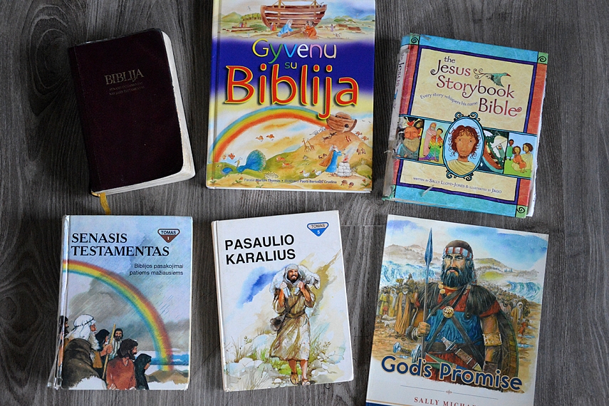 Štai kelios (tiesa, ne visos) iš Aurimo naudojamų knygų. Kelių trūksta (paskolinome), bet praeituose įrašuose esu minėjusi: "Training Hearts, Teaching Minds“, "Who is God", Sally Michael knygos. Tiesa, Jesus Storybook Bible yra daugelio šeimų pamėgta ir numylėta. Yra vertimas į rusų kalbą, o šiuo metu kiek žinau ruošiamas ir lietuviškas leidimas.
