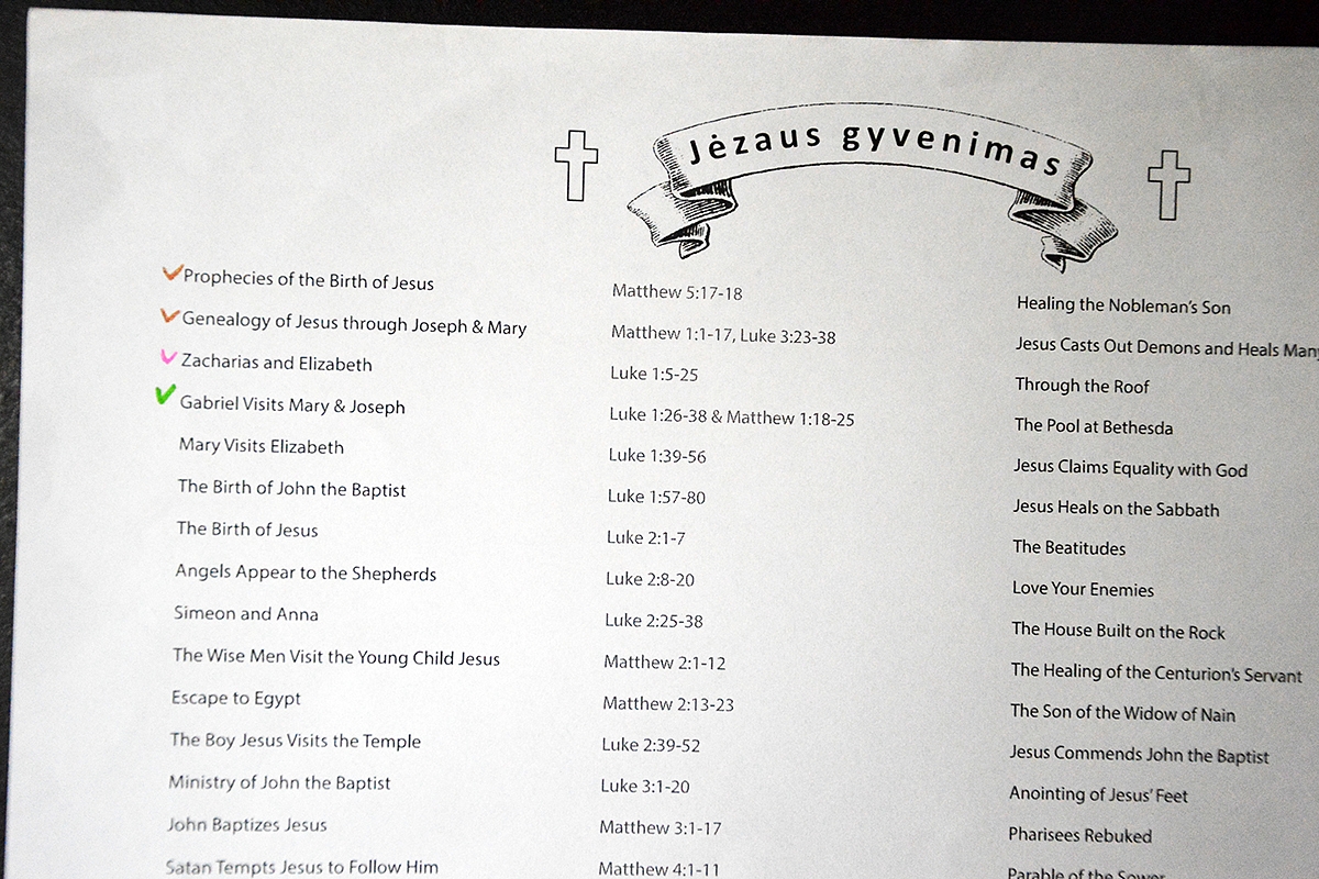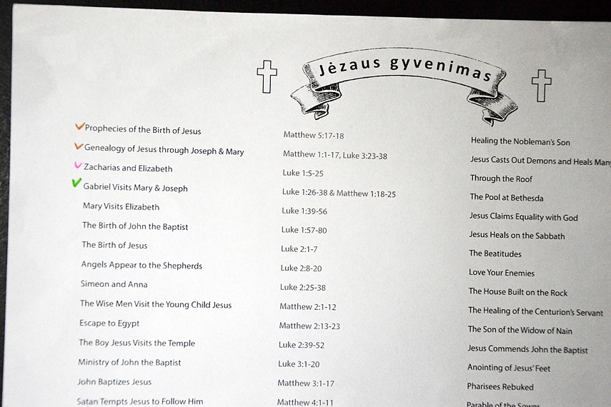Šiemet su vaikais planuojame skaityti tikrą (t.y. ne vaikišką) Bibliją. Skaitysime vakarais, kartu su visa šeima. Pradėsime nuo Jėzaus gyvenimo (iki Kalėdų turėtumėm užbaigti visas evangelijas). Internete radau labai šaunų temomis suskirstytą skaitymo planą. Jį atsispaudinau, pakabinau ant sienos. Perskaitę vieną dalį, užspalvinam rutuliuką "skaitymo žemėlapyje". O kad vaikams būtų motyvacia, pažadėjau, kad užspalvinus visą "žemėlapį", visi važiuosime į Anykščius į Kalitos kalną.