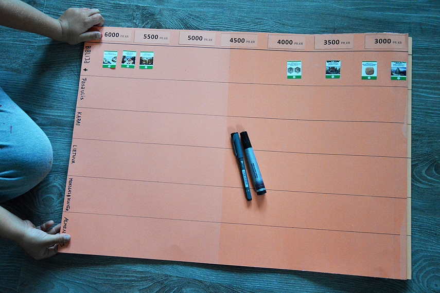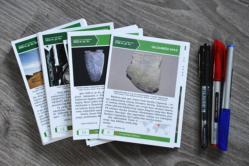Priemonės. Pirmiausia reikėtų turėti įvykių sąrašą, pagal kurį mokysite vaikus. Idealiausia, žinoma, nuo pradžios iki šių laikų, tačiau šiuo metu turime medžiagos tik šiems mokslo metams (sukūrimas > Kristus). Pagal mūsų turimą įvykių sąrašą Agnė iš Moliovaikų paruošė fantastišką mokymo priemonę.