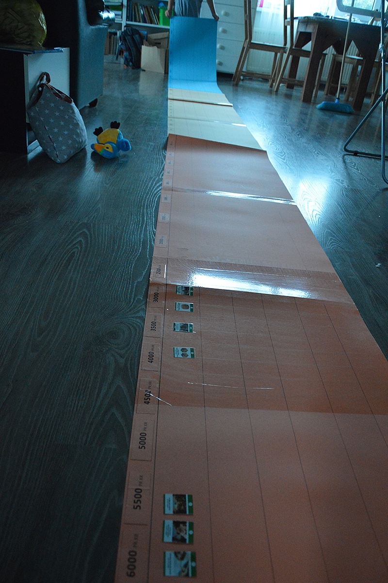 Viso šimtas su trupučiu įvykių per vienus mokslo metus. Visus šiuos įvykius trumpai aptariame ir klijuojame ant savo susikurtos laiko juostos. Laiko juostai pasigaminti tikslaus recepto nėra. Pavyzdžiui Agnė istorijos mokinimui pasigamino tokias sulankstomas amžių knygas. Aš mūsų laiko juostą gaminau iš A1 spalvoto kartono lapų. Suklijavau 11 lapų, padalinau laikotarpiais ir gavau.... labai labai ilgą, bet sulankstomą laiko juostą. Idealiu atveju tokia juosta turėtų būti naudojama iki pat 12 klasės, tad vertėtų ją pasaugoti ir pasirūpinti patvaresniu popieriumi.