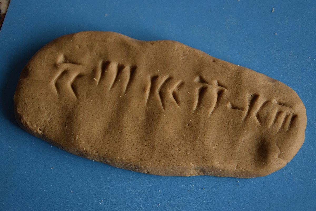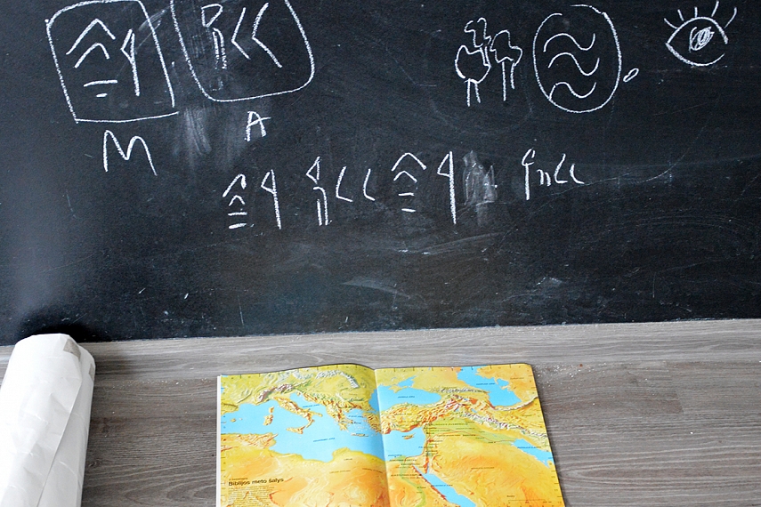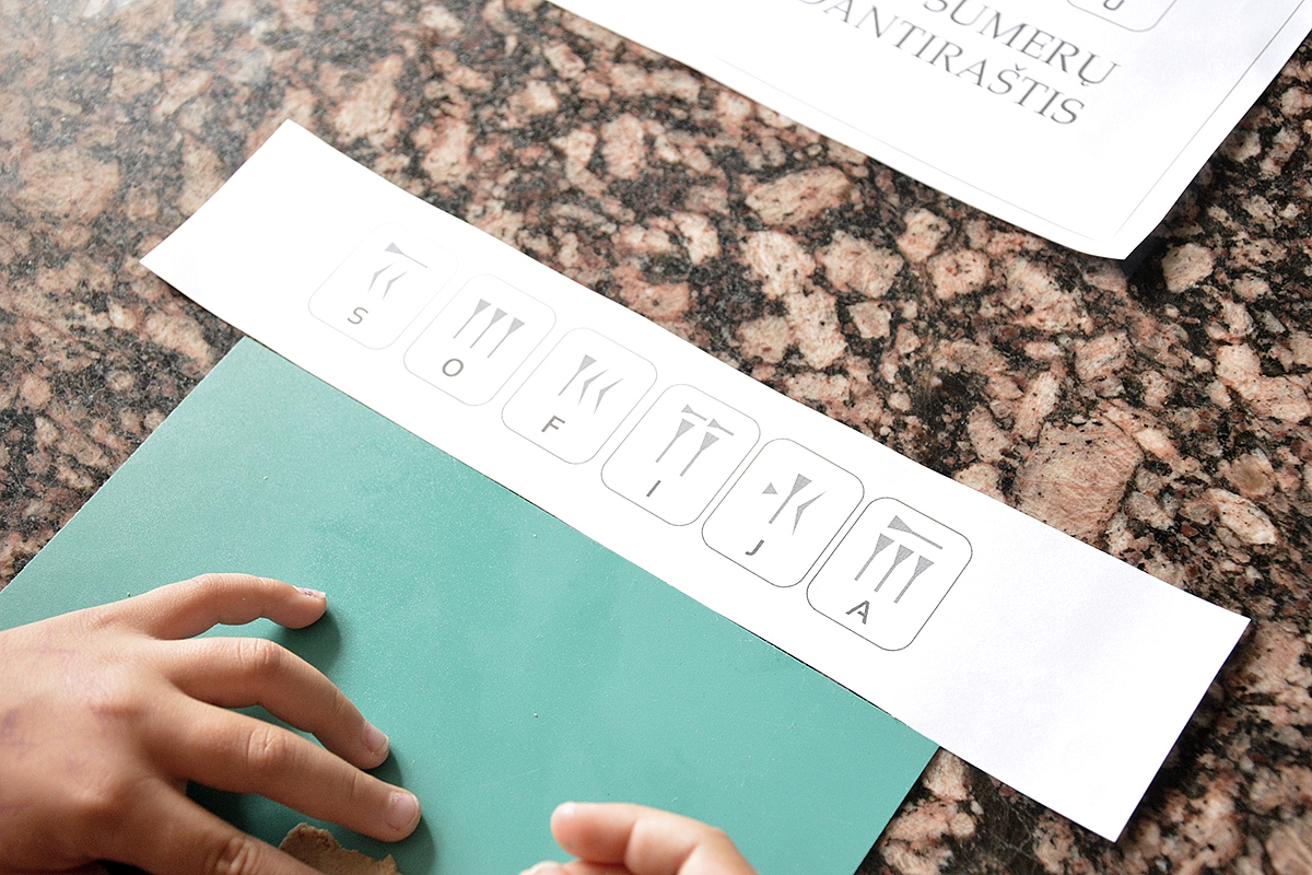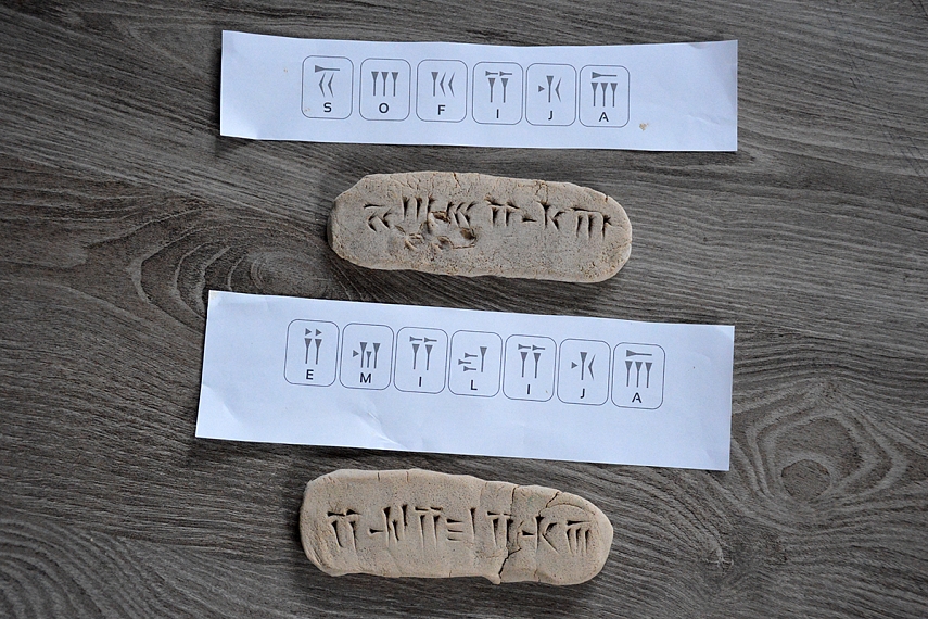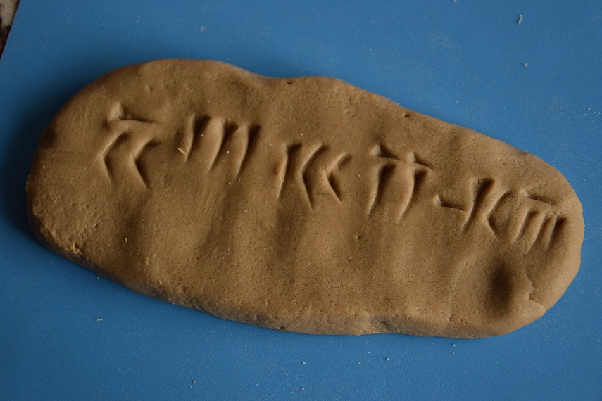 Paskui ant sienos nusipaišėm savo sukurtus hieroglifus, juos palyginome su šių laikų raidėmis. Pasvarstėm, kaip hieroglifų laikais būtų užrašytas žodis "mama". O kaip jis būtų užrašytas šiais laikais. Kai vaikai regis pagavo kampą dėl skirtumo tarp hieroglifo ir raidės, tuomet papasakojau apie dantiraštį. Šiai temai Agnė iš Moliovaikų buvo sugalvojusi fantastišką darbelį - ant molio plokščių dantiraščiu užsirašyti savo vardą. Mes taip ir darėm.