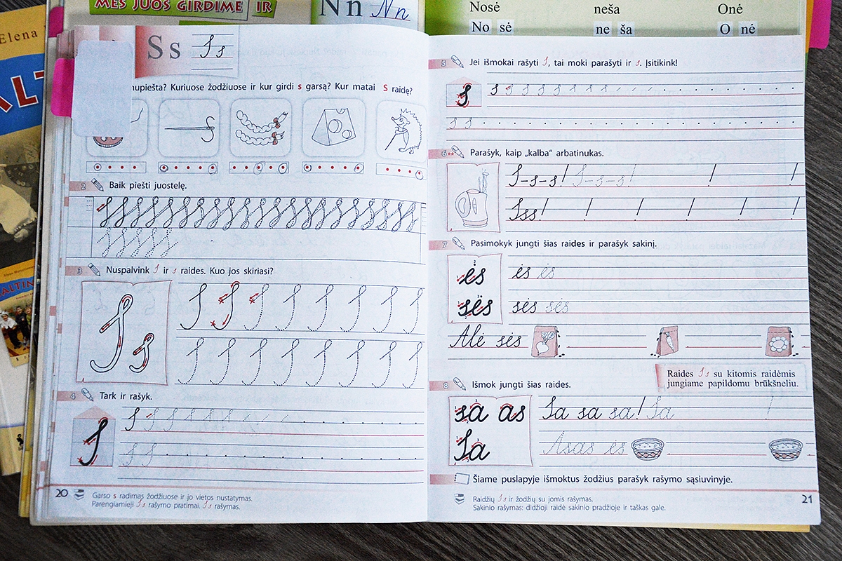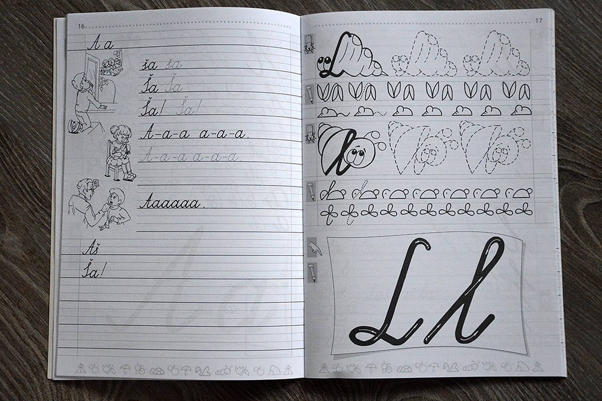 Pagal "Šaltinėlio" pamokas dar reikėtų reguliariai parašyti naujai išmoktų rašytinių raidžių diktantą (pvz. A, l, L, Ė, o, S ir pan).