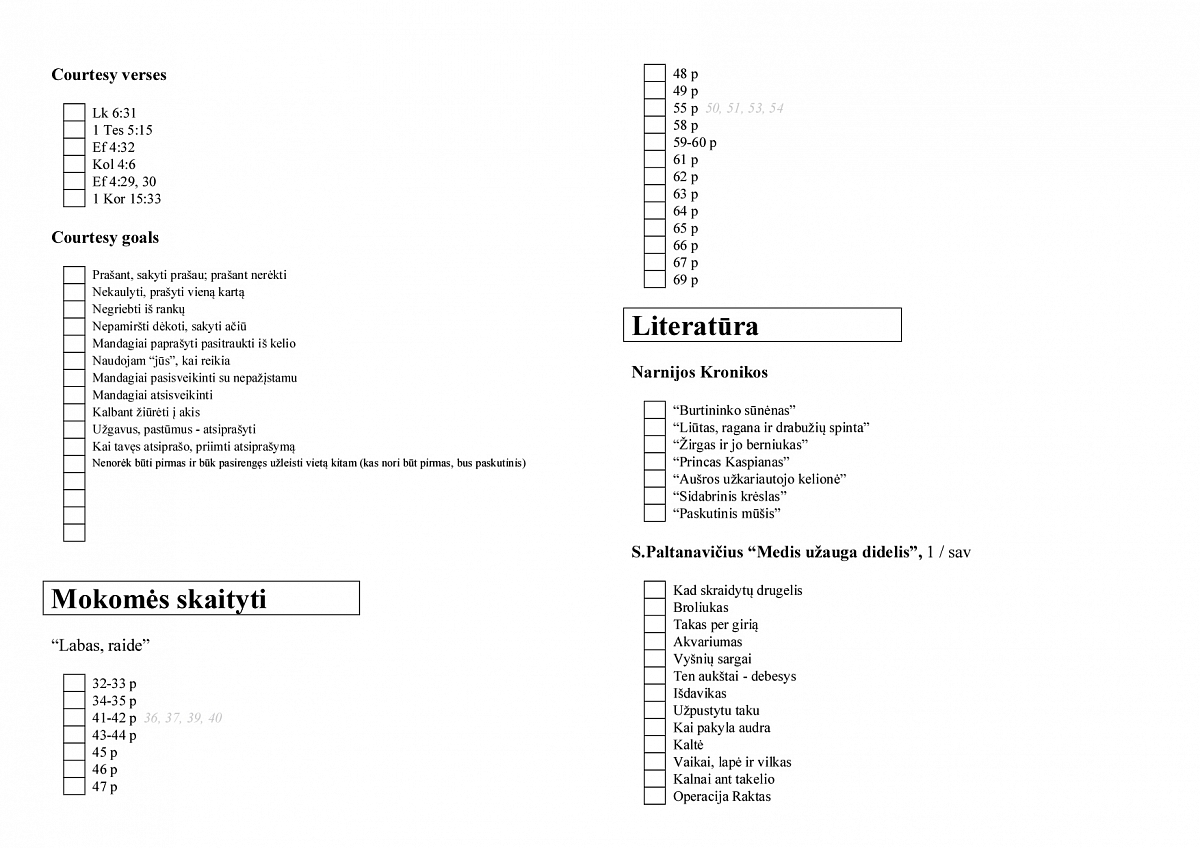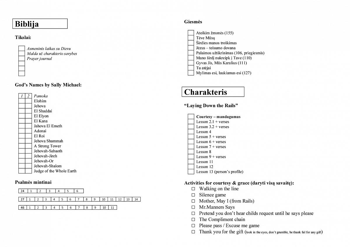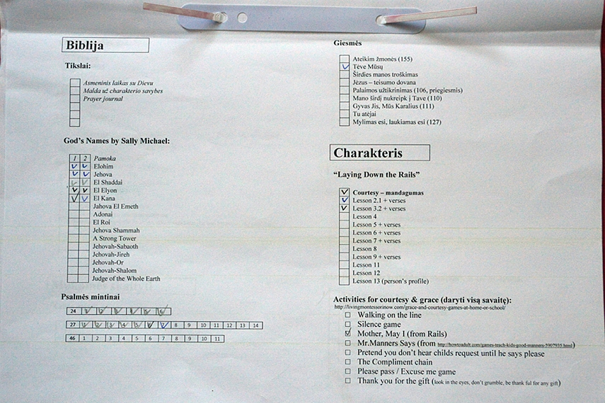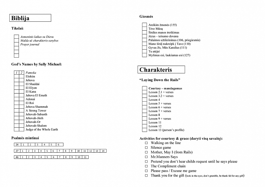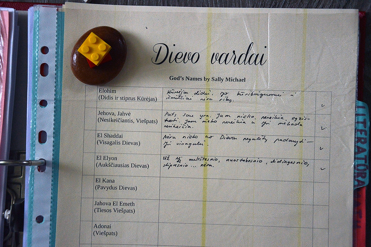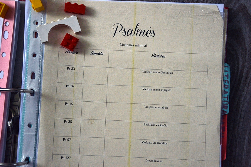 Čia turiu įsegtą Biblijos skaitymo planą vaikams, Dievo vardų sąrašą su pastabomis, Psalmių sąrašą (tų, kurias norėčiau mokėti mintinai), krikščioniškų knygų sąrašą (knygų, kurias norėčiau perskaityti pati ar perskaityti vaikams; pasižymiu tas knygas, kurias reikėtų įsigyti).