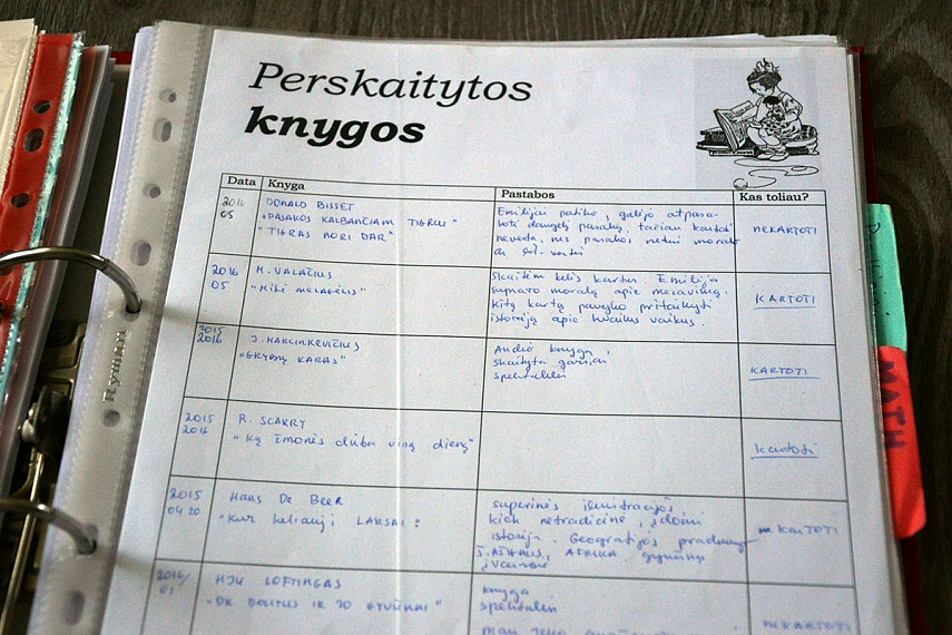 Čia žymiuosi visas mūsų perskaitytas knygas, bei turiu atsispausdinus bent kelis rekomenduojamų knygų sąrašus. Turiu įterpusi juodraštinį lapą, kuriame pasižymiu, kokias knygas galėčiau skaityti vaikams.