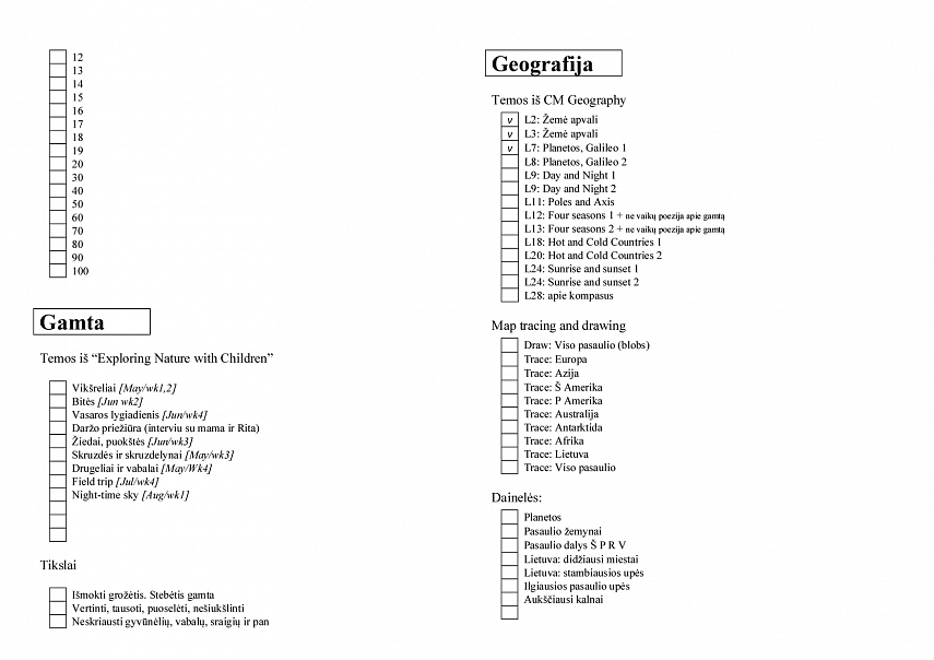 Šį sąrašą visą savaitę turiu po ranka, kad galėčiau išbraukti dalykus, kuriuos mokėmės. Atsispausdinau 12 kopijų (12-ai savaičių) – nesiterliojau su nutrinamais markeriais ir permatomomis įmautėmis.