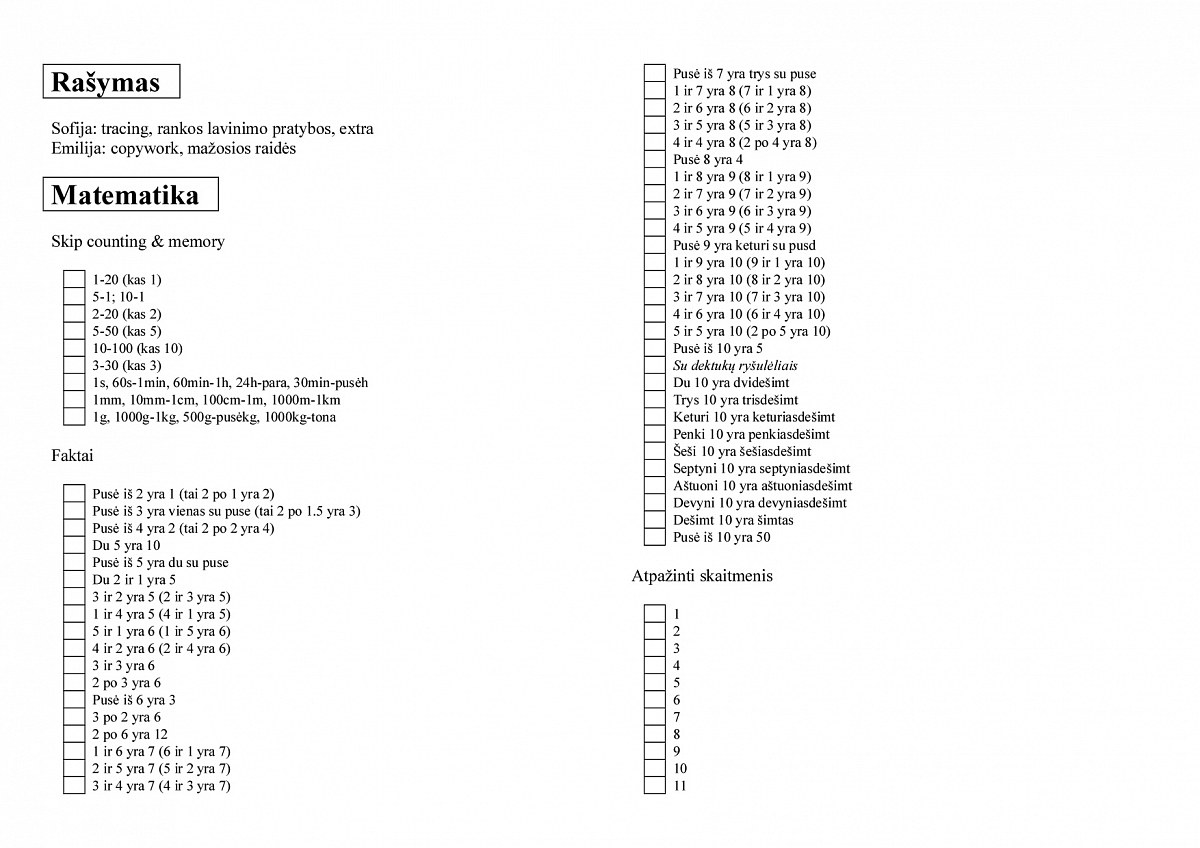 Tačiau kol mano programa dar keliauja, nusprendžiau sudėti pačius primityviausius pagrindus: atpažinti skaitmenis iki 20, skaičiuoti įvairiais būdais (iki 20, atgal iki 0, kas 2, kas 5, kas 10), bei įtvirtinti elemetariausius faktus (pvz. 2 kartus po 2, pusė iš 4, pusė iš 6, du kartus po 6 ir pan – tokių faktų turiu ištisą sąrašą). Susidariau sąrašą visų dalykų, kuriuos noriu įtvirtint. Dedu pliusiukus ir tiek. Labai primityvu, bet veiksminga. Sąrašiuką rasit kiek žemiau.