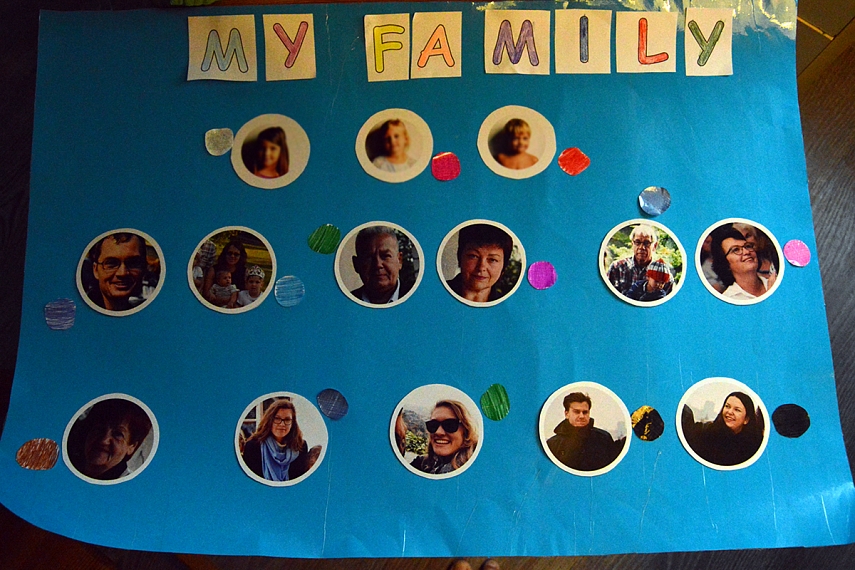 Pagaliau traukinys pajudėjo. Savaitės tema: "My Family". Nors pavėluotai, bet visgi pasigaminom šeimos plakatą, su visų artimųjų nuotraukomis.